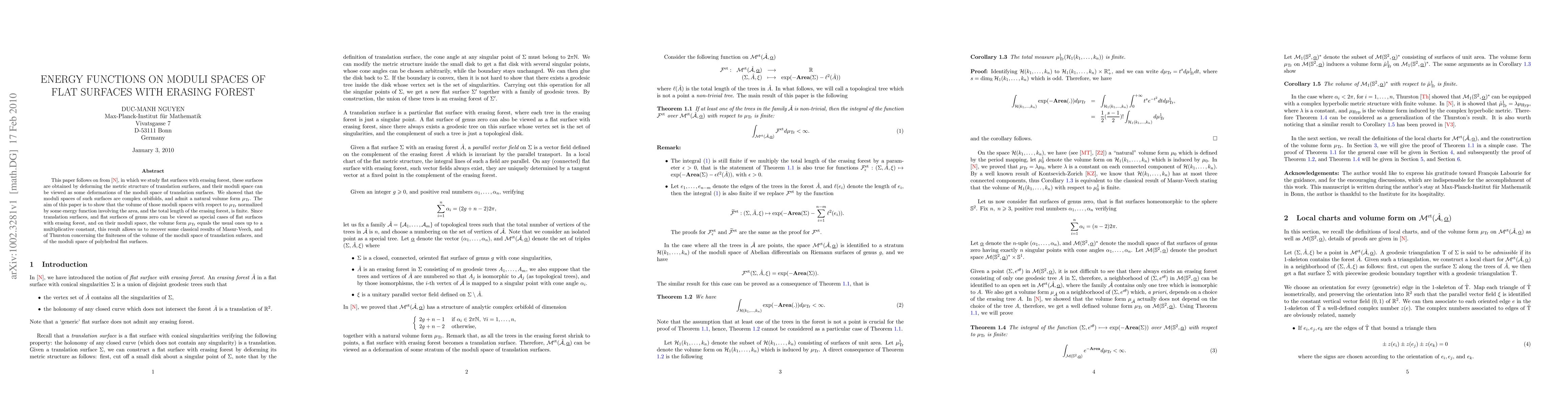 Flat surfaces with erasing forest are obtained by deforming the flat metric structure of translation surfaces, the moduli space of such surfaces is a deformation of the moduli space of translation surfaces. On the moduli space of flat surfaces with erasing forest, one can define some energy function involving the area of the surface, and the total length of the erasing forest. Note that on this space, we have a volume form which is defined by using geodesic triangulations. The aim of this paper is to prove that the integral of the energy functions mentionned above with respect to this volume form is finite. As applications, we will use this result to recover some classical results due to Masur-Veech, and Thurston.