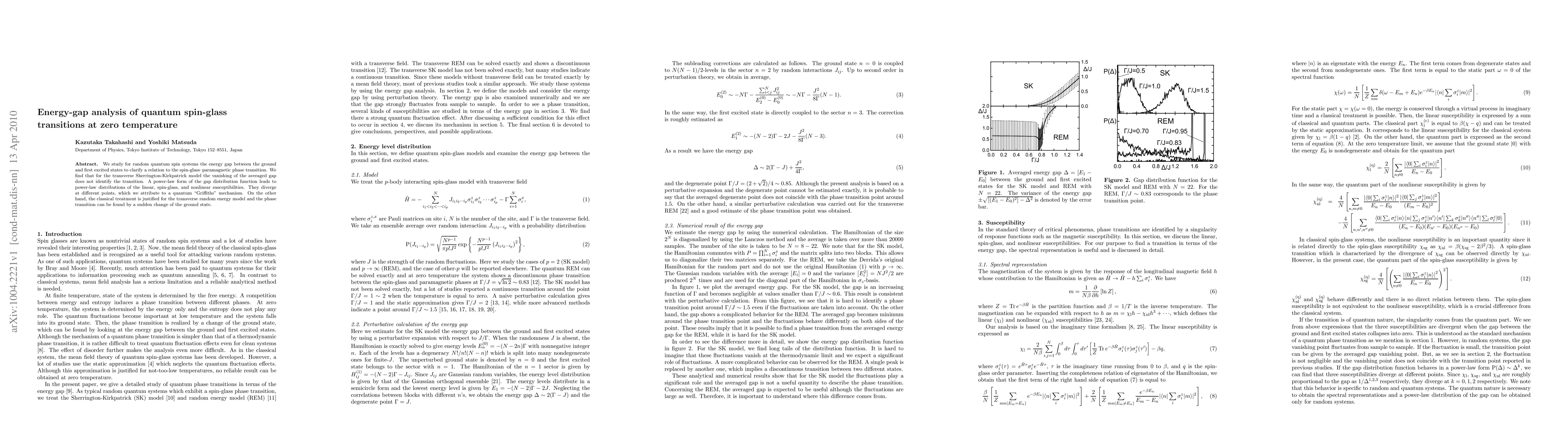 We study for random quantum spin systems the energy gap between the ground and first excited states to clarify a relation to the spin-glass-paramagnetic phase transition. We find that for the transverse Sherrington-Kirkpatrick model the vanishing of the averaged gap does not identify the transition. A power-law form of the gap distribution function leads to power-law distributions of the linear, spin-glass, and nonlinear susceptibilities. They diverge at different points, which we attribute to a quantum Griffiths mechanism. On the other hand, the classical treatment is justified for the transverse random energy model and the phase transition can be found by a sudden change of the ground state.