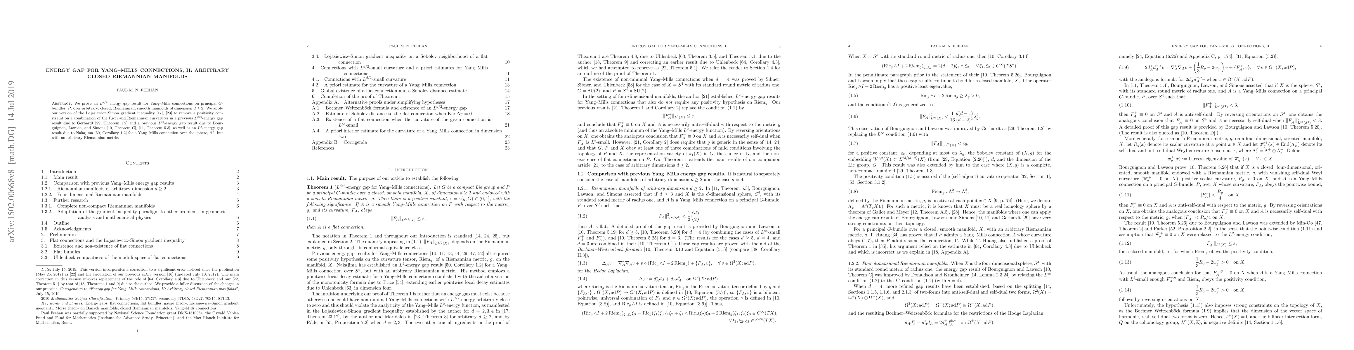 In this sequel to [arXiv:1412.4114], we prove an $L^{d/2}$ energy gap result for Yang-Mills connections on principal $G$-bundles, $P$, over arbitrary, closed, Riemannian, smooth manifolds of dimension $d\geq 2$. We apply our version of the Lojasiewicz-Simon gradient inequality [arXiv:1409.1525, arXiv:1510.03815] to remove a positivity constraint on a combination of the Ricci and Riemannian curvatures in a previous $L^{d/2}$-energy gap result due to Gerhardt (2010) and a previous $L^\infty$-energy gap result due to Bourguignon, Lawson, and Simons (1981, 1979), as well as an $L^2$-energy gap result due to Nakajima (1987) for a Yang-Mills connection over the sphere, $S^d$, but with an arbitrary Riemannian metric. The main correction in this version involves replacement of the role of Corollary 4.3 due to Uhlenbeck (1985) and Theorem 5.1 due to the author in the published version of this article at http://dx.doi.org/10.1016/j.aim.2017.03.023 by that of Theorems 1 and 9 due to the author in arXiv:1906.03954.