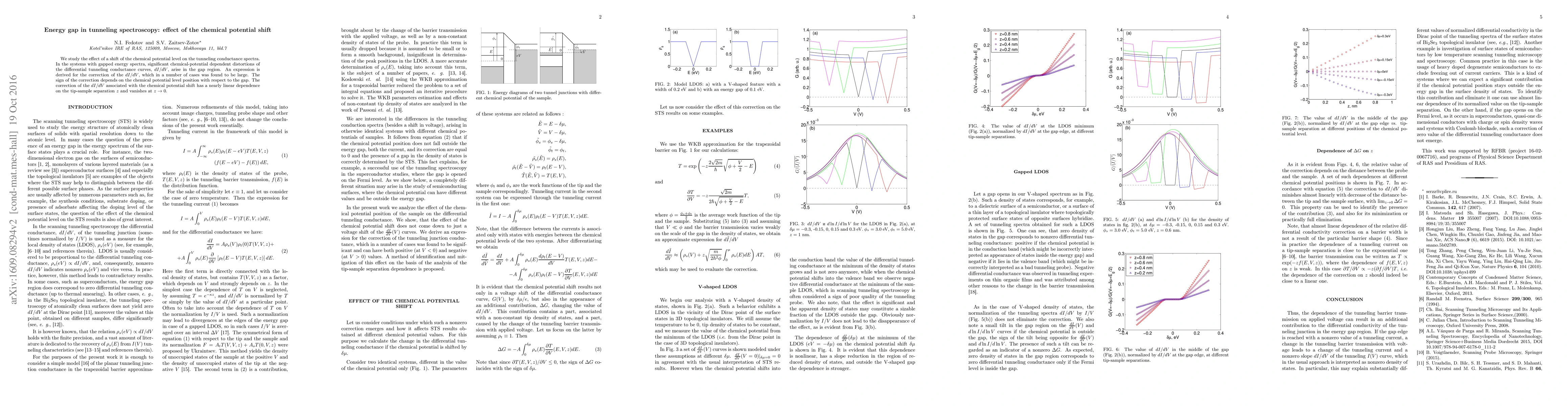 This paper investigates how shifts in the chemical potential affect the tunneling conductance spectra, particularly in systems with gapped energy spectra. It derives an expression for the correction to the differential tunneling conductance, $dI/dV$, which shows significant chemical-potential dependent distortions in the gap region, with a nearly linear dependence on tip-sample separation.