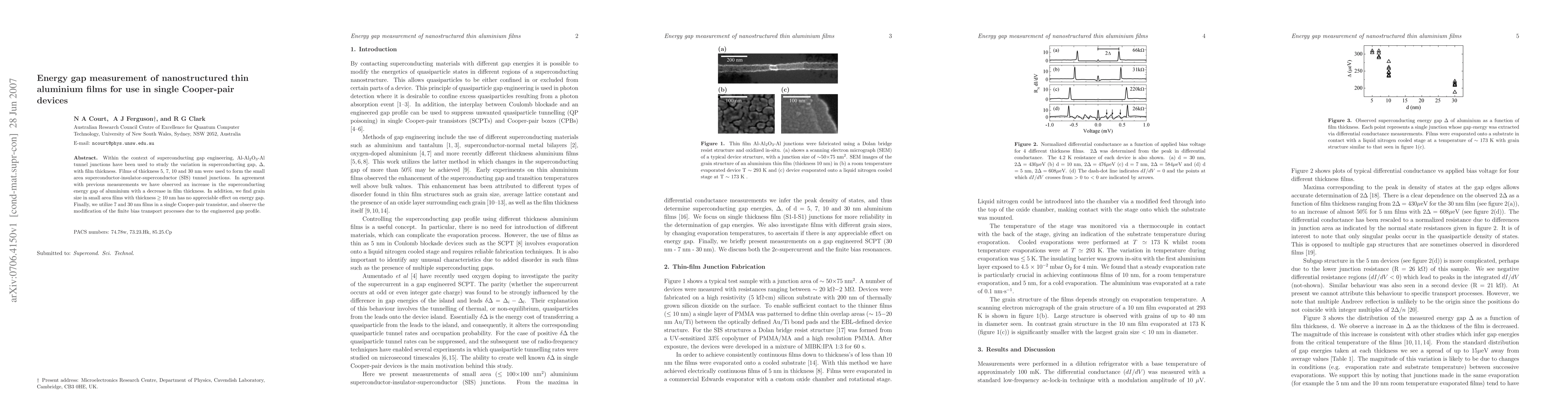 Within the context of superconducting gap engineering, Al-\alox-Al tunnel junctions have been used to study the variation in superconducting gap, $\Delta$, with film thickness. Films of thickness 5, 7, 10 and 30 nm were used to form the small area superconductor-insulator-superconductor (SIS) tunnel junctions. In agreement with previous measurements we have observed an increase in the superconducting energy gap of aluminium with a decrease in film thickness. In addition, we find grain size in small area films with thickness \textbf{$\geq$} 10 nm has no appreciable effect on energy gap. Finally, we utilize 7 and 30 nm films in a single Cooper-pair transistor, and observe the modification of the finite bias transport processes due to the engineered gap profile.