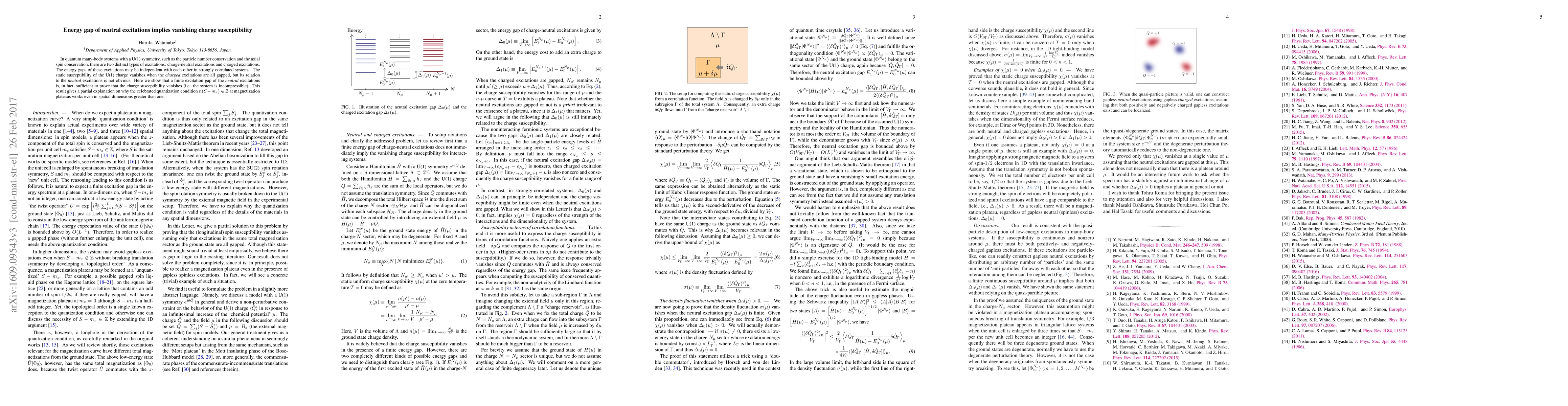 Summary: This paper demonstrates that a finite energy gap in neutral excitations within U(1) symmetric quantum many-body systems leads to the vanishing of charge susceptibility, indicating system incompressibility. This finding provides insight into the quantization condition observed in magnetization plateaus in higher dimensions.
