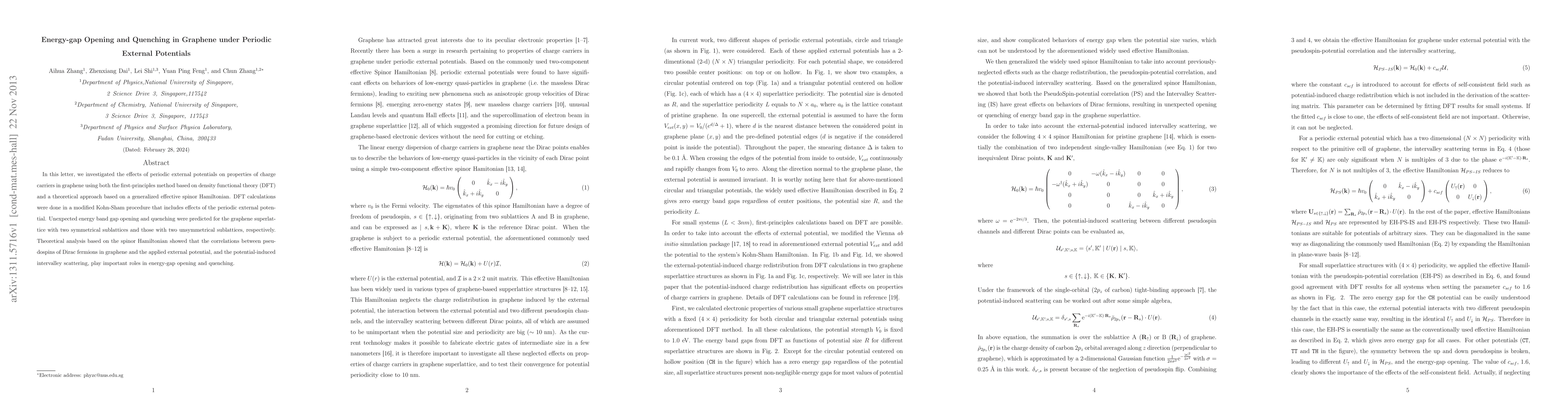 In this paper, we investigated the effects of periodic external potentials on properties of charge carriers in graphene using both the first-principles method based on density functional theory (DFT) and a theoretical approach based on a generalized effective spinor Hamiltonian. DFT calculations were done in a modified Kohn-Sham procedure that includes effects of the periodic external potential. Unexpected energy band gap opening and quenching were predicted for the graphene superlattice with two symmetrical sublattices and those with two unsymmetrical sublattices, respectively. Theoretical analysis based on the spinor Hamiltonian showed that the correlations between pseudospins of Dirac fermions in graphene and the applied external potential, and the potential-induced intervalley scattering, play important roles in energy-gap opening and quenching.