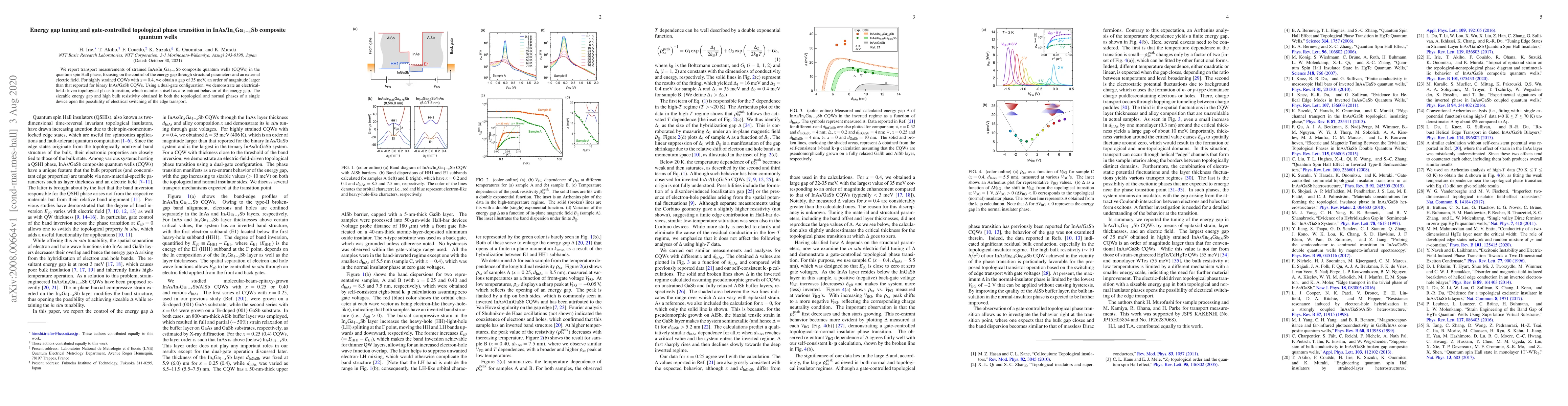 We report transport measurements of strained InAs/In$_{x}$Ga$_{1-x}$Sb composite quantum wells (CQWs) in the quantum spin Hall phase, focusing on the control of the energy gap through structural parameters and an external electric field. For highly strained CQWs with $x = 0.4$, we obtain a gap of 35 meV, an order of magnitude larger than that reported for binary InAs/GaSb CQWs. Using a dual-gate configuration, we demonstrate an electrical-field-driven topological phase transition, which manifests itself as a re-entrant behavior of the energy gap. The sizeable energy gap and high bulk resistivity obtained in both the topological and normal phases of a single device open the possibility of electrical switching of the edge transport.
