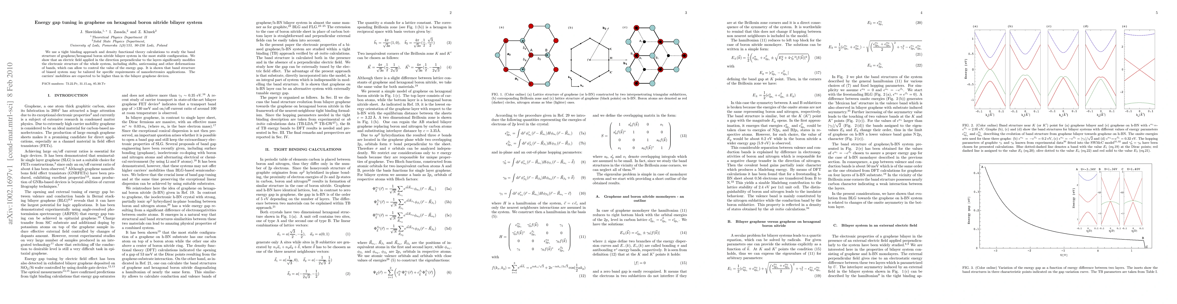 Summary: Researchers employ tight binding and density functional theory to investigate the electronic structure of graphene on hexagonal boron nitride bilayers, demonstrating that perpendicular electric fields can significantly alter the band structure and energy gap, potentially enhancing carrier mobility for nanoelectronics applications.