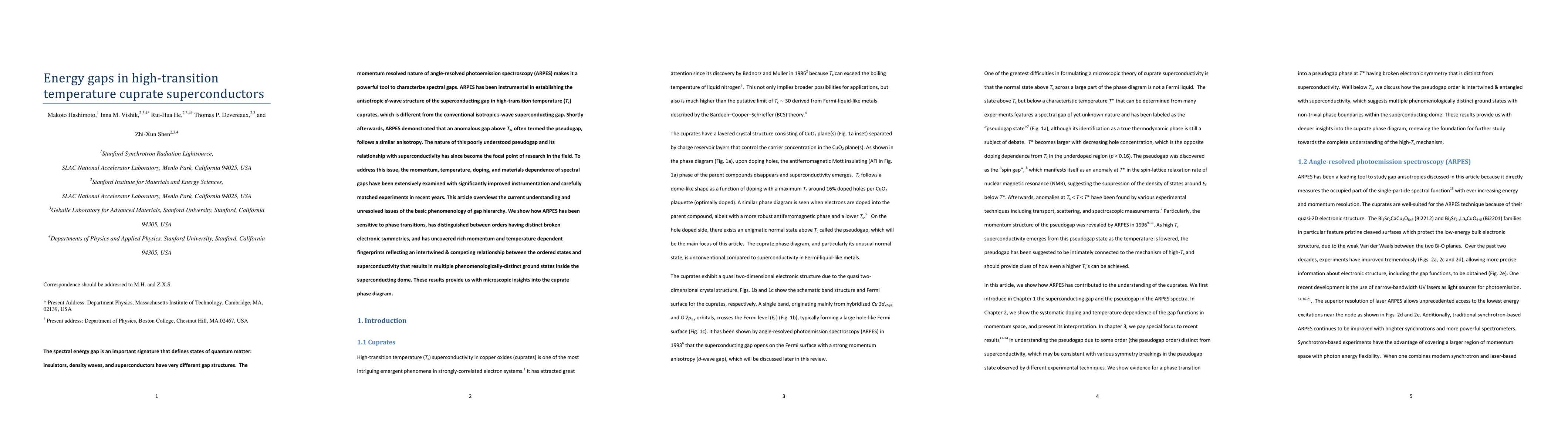 This paper reviews the use of angle-resolved photoemission spectroscopy (ARPES) to investigate the spectral energy gaps in high-transition temperature cuprate superconductors, highlighting the anisotropic d-wave superconducting gap and the enigmatic pseudogap above Tc. It discusses the complex interplay between these gaps and the resulting multiple ground states within the superconducting phase.