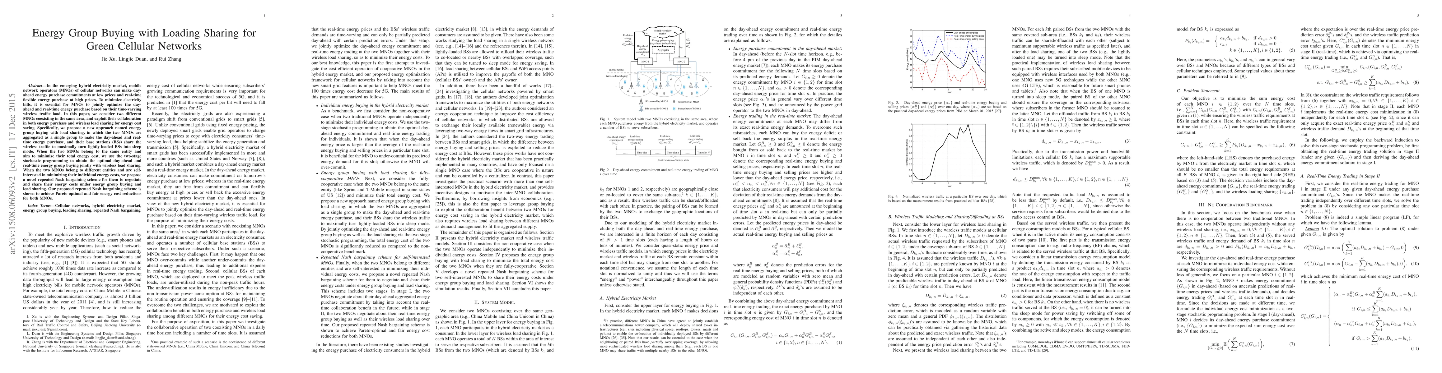 In the emerging hybrid electricity market, mobile network operators (MNOs) of cellular networks can make day-ahead energy purchase commitments at low prices and real-time flexible energy purchase at high prices. To minimize electricity bills, it is essential for MNOs to jointly optimize the day-ahead and real-time energy purchase based on their time-varying wireless traffic load. In this paper, we consider two different MNOs coexisting in the same area, and exploit their collaboration in both energy purchase and wireless load sharing for energy cost saving. Specifically, we propose a new approach named energy group buying with load sharing, in which the two MNOs are aggregated as a single group to make the day-ahead and real-time energy purchase, and their base stations (BSs) share the wireless traffic to maximally turn lightly-loaded BSs into sleep mode. When the two MNOs belong to the same entity and aim to minimize their total energy cost, we use the two-stage stochastic programming to obtain the optimal day-ahead and real-time energy group buying jointly with wireless load sharing. When the two MNOs belong to different entities and are self-interested in minimizing their individual energy costs, we propose a novel repeated Nash bargaining scheme for them to negotiate and share their energy costs under energy group buying and load sharing. Our proposed repeated Nash bargaining scheme is shown to achieve Pareto-optimal and fair energy cost reductions for both MNOs.