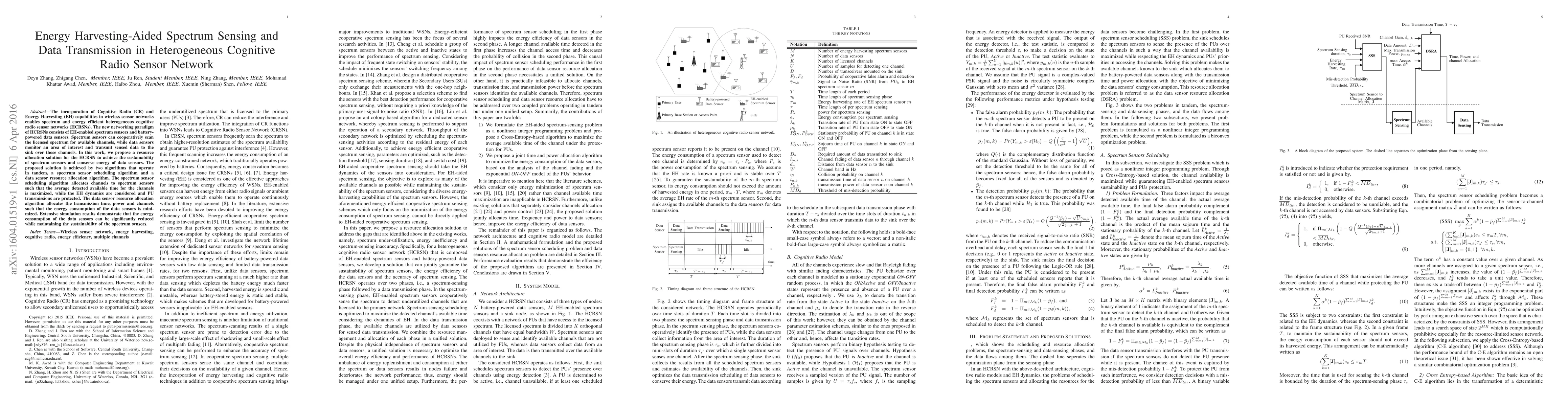 This paper proposes resource allocation algorithms for heterogeneous cognitive radio sensor networks (HCRSNs) that integrate energy harvesting and cognitive radio technologies. The algorithms aim to maximize the sustainability of spectrum sensors and minimize the energy consumption of data sensors, achieving significant energy savings through simulations.
