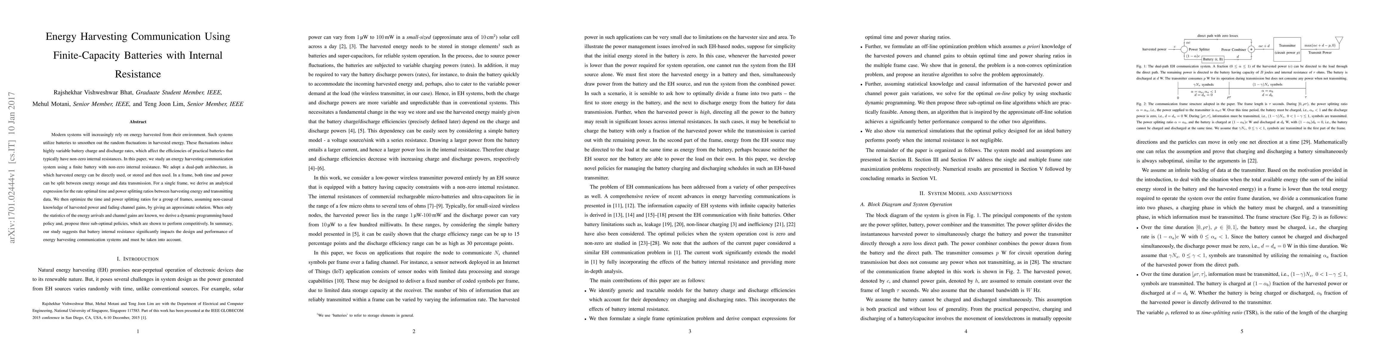 This paper investigates the optimization of energy harvesting communication systems with finite-capacity batteries featuring internal resistance. It proposes analytical and dynamic programming-based methods for optimal time and power splitting strategies, demonstrating the significant impact of internal resistance on system performance.