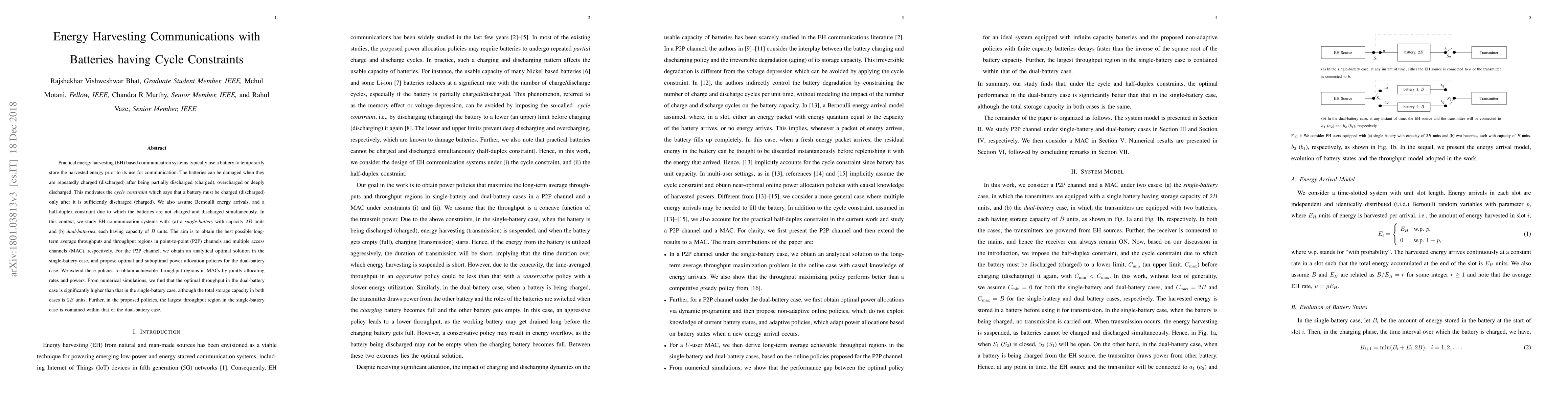 Practical energy harvesting (EH) based communication systems typically use a battery to temporarily store the harvested energy prior to its use for communication. The batteries can be damaged when they are repeatedly charged (discharged) after being partially discharged (charged), overcharged or deeply discharged. This motivates the cycle constraint which says that a battery must be charged (discharged) only after it is sufficiently discharged (charged). We also assume Bernoulli energy arrivals, and a half-duplex constraint due to which the batteries are not charged and discharged simultaneously. In this context, we study EH communication systems with: (a) a single-battery with capacity 2B units and (b) dual-batteries, each having capacity of B units. The aim is to obtain the best possible long-term average throughputs and throughput regions in point-to-point (P2P) channels and multiple access channels (MAC), respectively. For the P2P channel, we obtain an analytical optimal solution in the single-battery case, and propose optimal and sub-optimal power allocation policies for the dual-battery case. We extend these policies to obtain achievable throughput regions in MACs by jointly allocating rates and powers. From numerical simulations, we find that the optimal throughput in the dual-battery case is significantly higher than that in the single-battery case, although the total storage capacity in both cases is 2B units. Further, in the proposed policies, the largest throughput region in the single-battery case is contained within that of the dual-battery case.