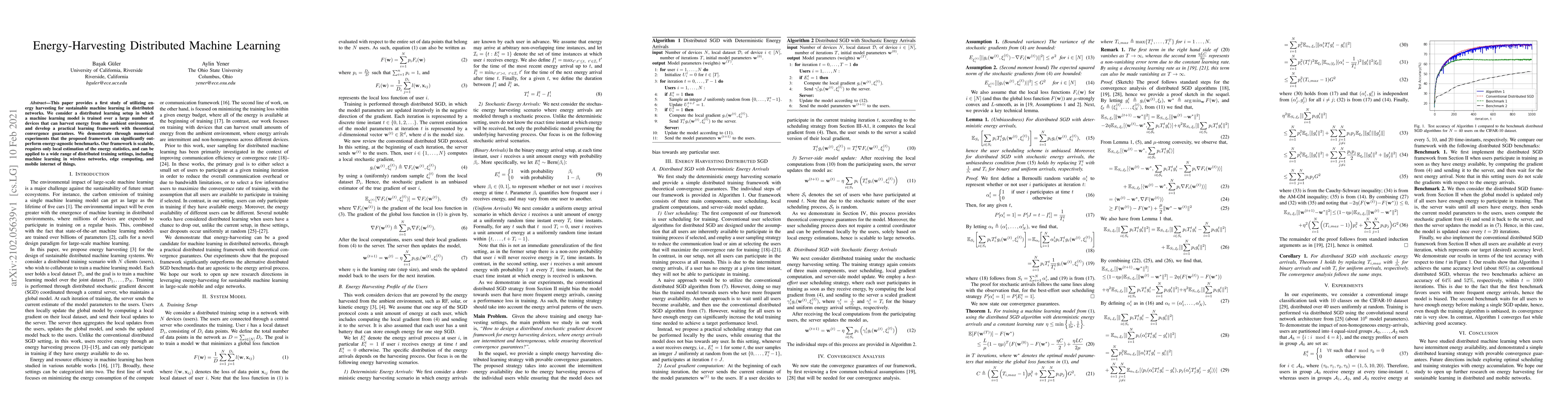 This research introduces an energy-harvesting framework for sustainable machine learning in distributed networks, providing theoretical guarantees and outperforming energy-agnostic benchmarks through numerical experiments. The method is scalable, requires minimal local energy statistics, and applicable to diverse distributed training settings, including wireless networks, edge computing, and IoT.