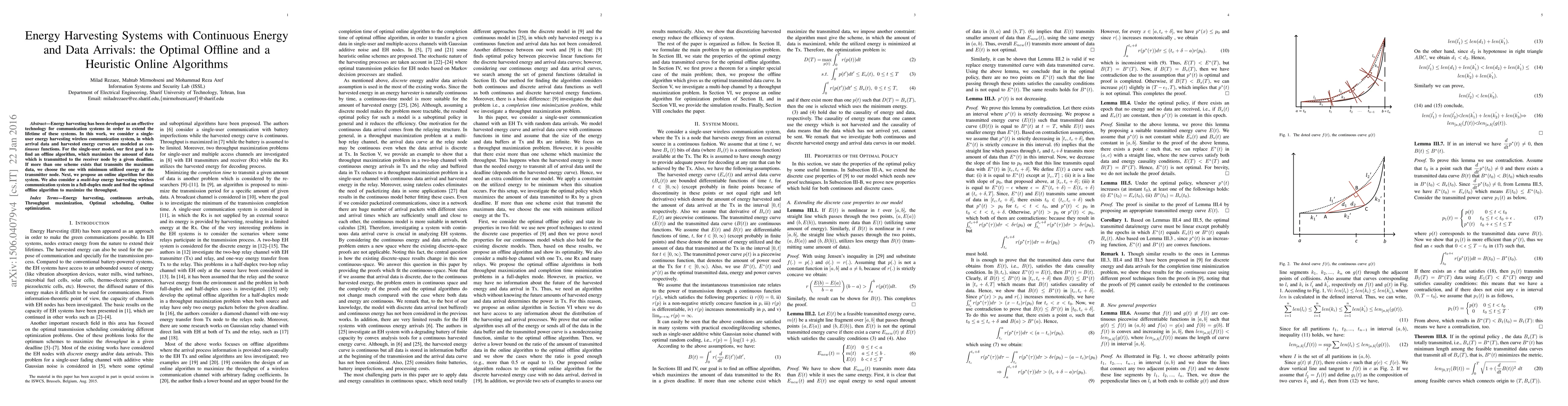 This paper develops algorithms for energy harvesting communication systems with continuous energy and data arrivals. It proposes an optimal offline algorithm to maximize data transmission within a deadline and a heuristic online algorithm for a single-user system, while also finding the optimal offline algorithm for maximizing throughput in a multi-hop full-duplex system.