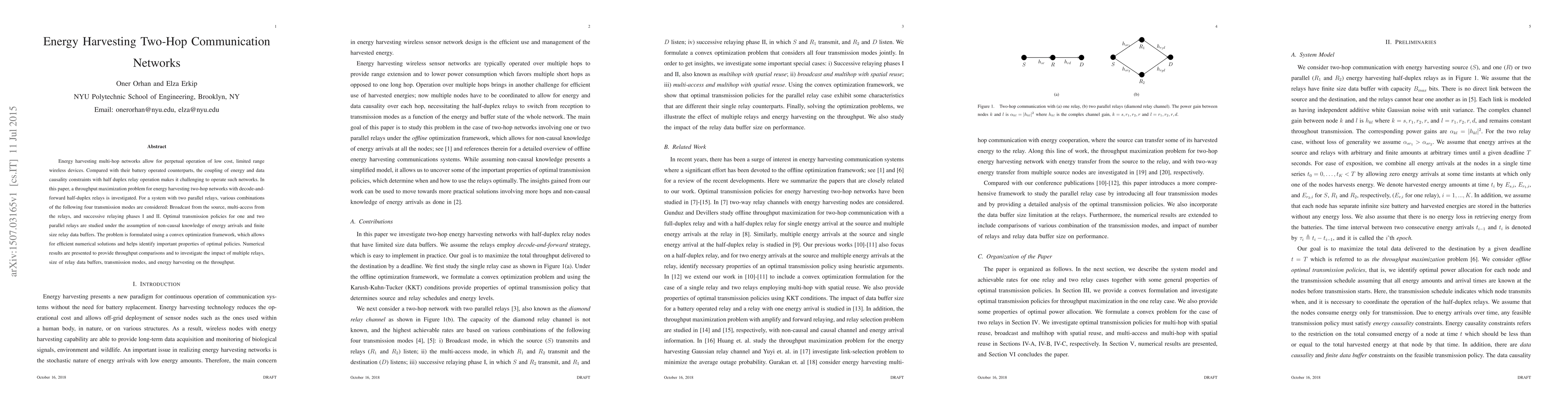 This paper investigates throughput maximization in energy harvesting two-hop networks with half-duplex relays using decode-and-forward. It formulates the problem using a convex optimization framework to study optimal transmission policies under non-causal energy arrival knowledge and finite relay buffers.
