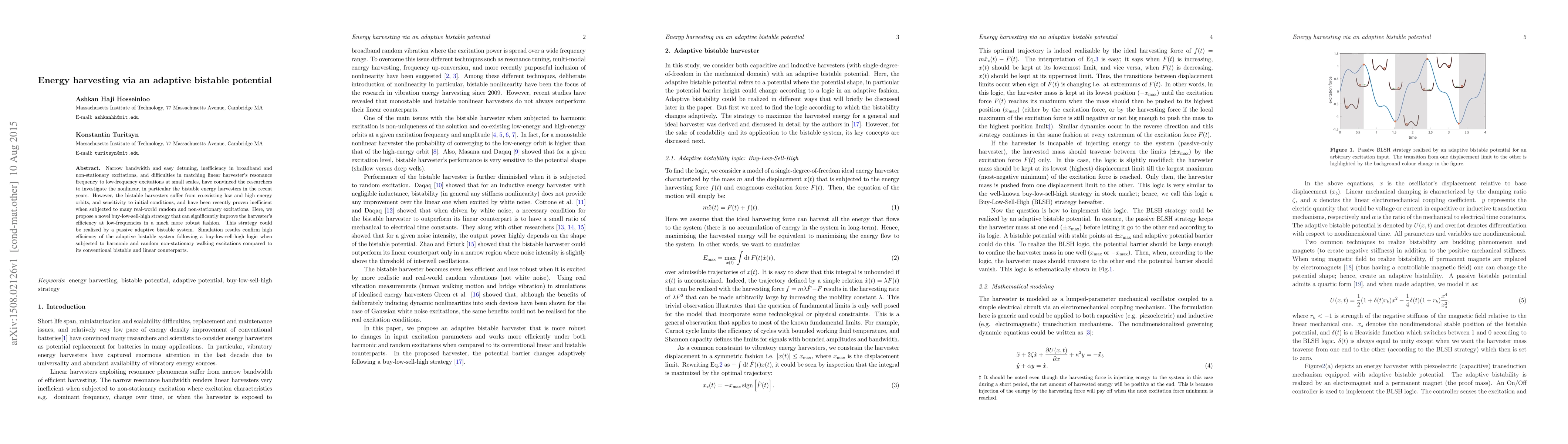 This paper proposes an adaptive bistable potential strategy to enhance energy harvesting efficiency, particularly at low frequencies, by employing a buy-low-sell-high approach. Simulation results show that this adaptive system outperforms conventional bistable and linear harvesters under both harmonic and random non-stationary excitations.