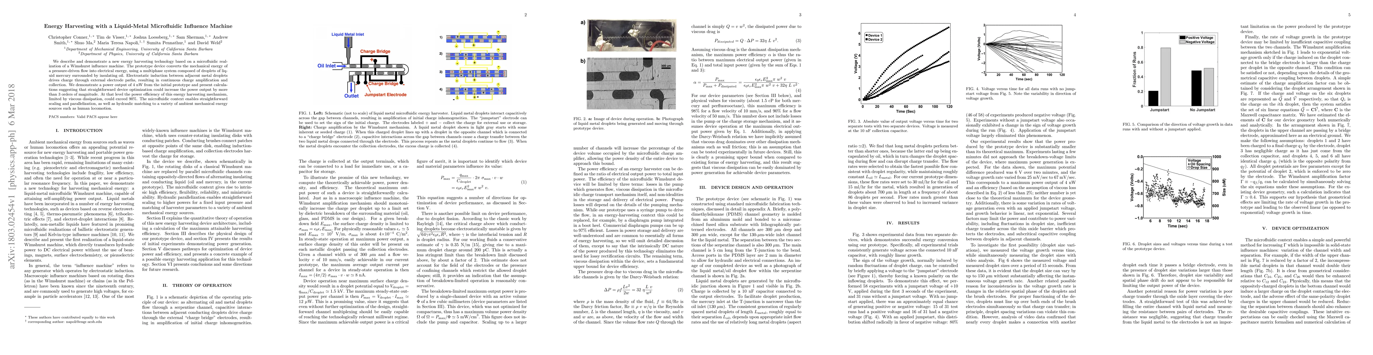 This paper introduces a novel energy harvesting device based on a microfluidic Wimshurst influence machine, converting mechanical energy from liquid flow into electrical energy via electrostatic induction. Initial prototype demonstrates 4 nW output, with potential for significant power increase through optimization.