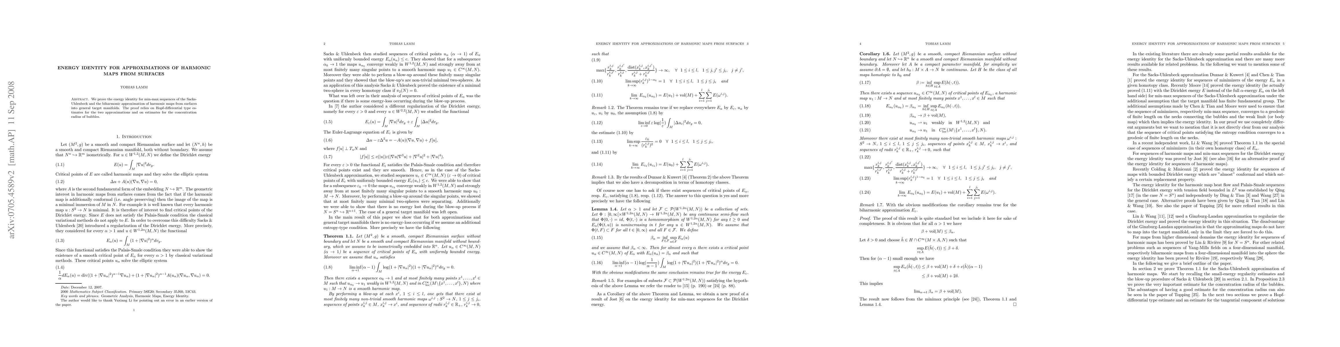 This paper establishes the energy identity for min-max sequences in the approximations of harmonic maps from surfaces, using Hopf-differential estimates and concentration radius estimates for bubbles in both the Sacks-Uhlenbeck and biharmonic approximations.