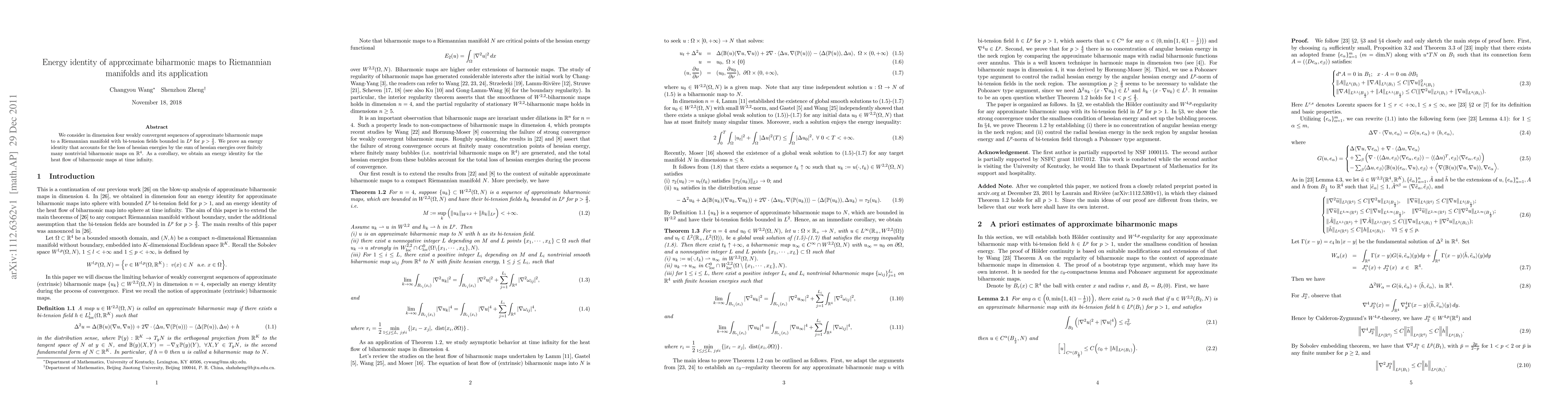We consider in dimension four weakly convergent sequences of approximate biharmonic maps to a Riemannian manifold with bi-tension fields bounded in $L^p$ for $p>\frac43$. We prove an energy identity that accounts for the loss of hessian energies by the sum of hessian energies over finitely many nontrivial biharmonic maps on $\mathbb R^4$. As a corollary, we obtain an energy identity for the heat flow of biharmonic maps at time infinity.