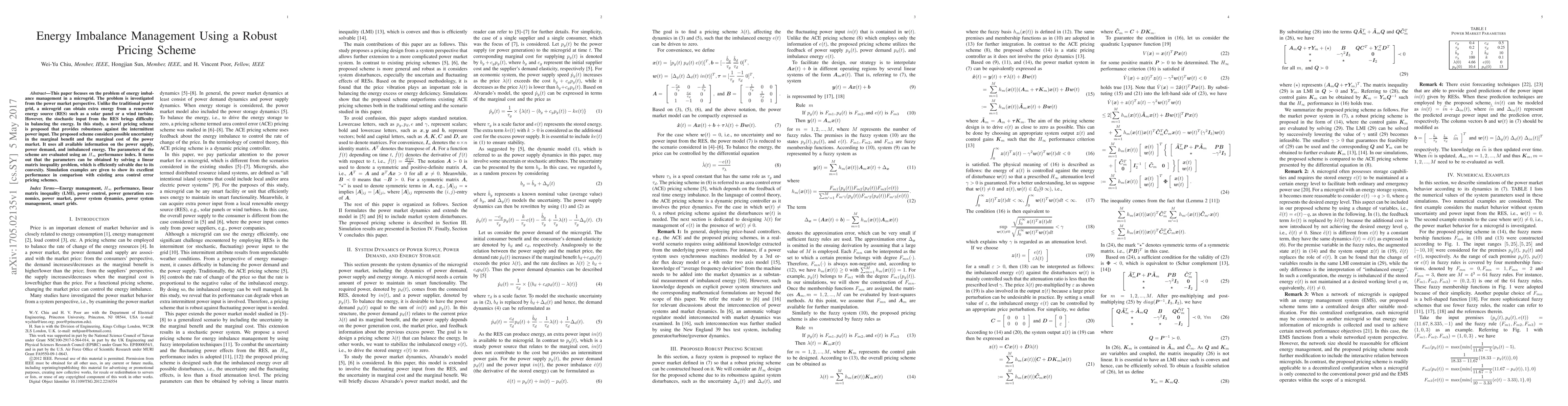 This paper focuses on the problem of energy imbalance management in amicrogrid. The problem is investigated from the power market perspective. Unlike the traditional power grid, a microgrid can obtain extra energy froma renewable energy source (RES) such as a solar panel or a wind turbine. However, the stochastic input from the RES brings difficulty in balancing the energy supply and demand. In this study, a novel pricing scheme is proposed that provides robustness against such intermittent power input. The proposed scheme considers possible uncertainty in the marginal benefit and the marginal cost of the power market. It uses all available information on the power supply, power demand, and imbalanced energy. The parameters of the scheme are evaluated using an performance index. It is shown that the parameters can be obtained by solving a linear matrix inequality problem, which is efficiently solvable due to its convexity. Simulation examples are given to show the favorable performance of the proposed scheme in comparison with existing area control error pricing schemes.