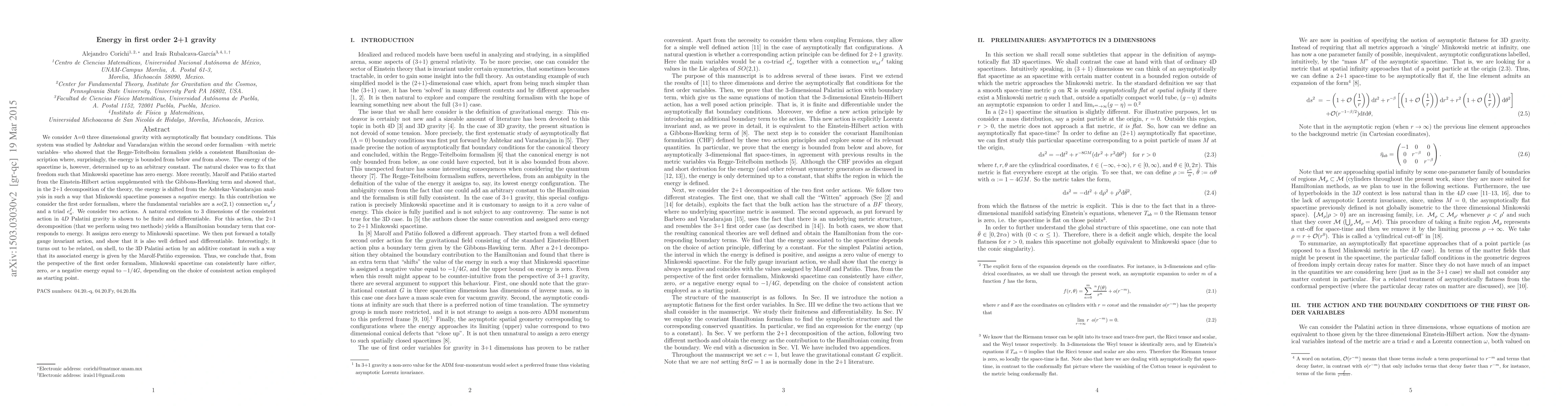 We consider $\Lambda$=0 three dimensional gravity with asymptotically flat boundary conditions. This system was studied by Ashtekar and Varadarajan within the second order formalism -with metric variables- who showed that the Regge-Teitelboim formalism yields a consistent Hamiltonian description where, surprisingly, the energy is bounded from below and from above. The energy of the spacetime is, however, determined up to an arbitrary constant. The natural choice was to fix that freedom such that Minkowski spacetime has zero energy. More recently, Marolf and Pati\~no started from the Einstein-Hilbert action supplemented with the Gibbons-Hawking term and showed that, in the 2+1 decomposition of the theory, the energy is shifted from the Ashtekar-Varadarajan analysis in such a way that Minkowski spacetime possesses a negative energy. In this contribution we consider the first order formalism, where the fundamental variables are a so(2,1) connection $\omega_a{^I}_J$ and a triad $e_a^I$. We consider two actions. A natural extension to 3 dimensions of the consistent action in 4D Palatini gravity is shown to be finite and differentiable. For this action, the 2+1 decomposition (that we perform using two methods) yields a Hamiltonian boundary term that corresponds to energy. It assigns zero energy to Minkowski spacetime. We then put forward a totally gauge invariant action, and show that it is also well defined and differentiable. Interestingly, it turns out to be related, on shell, to the 3D Palatini action by an additive constant in such a way that its associated energy is given by the Marolf-Pati\~no expression. Thus, we conclude that, from the perspective of the first order formalism, Minkowski spacetime can consistently have either, zero, or a negative energy equal to -1/4G, depending on the choice of consistent action employed as starting point.