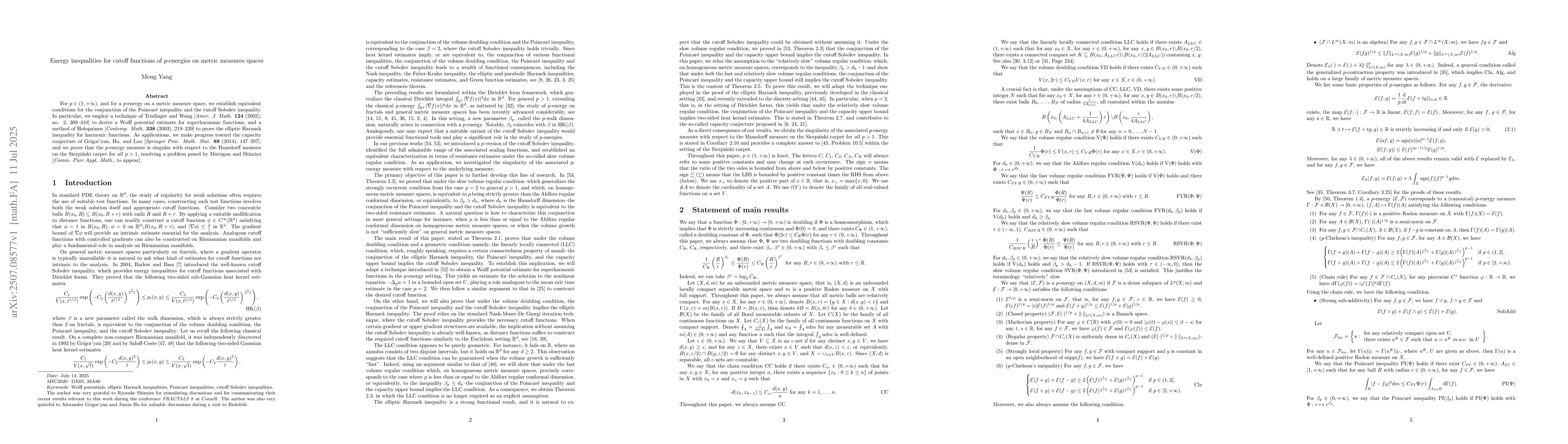For $p\in(1,+\infty)$, and for a $p$-energy on a metric measure space, we establish equivalent conditions for the conjunction of the Poincar\'e inequality and the cutoff Sobolev inequality. In particular, we employ a technique of Trudinger and Wang [Amer. J. Math. 124 (2002), no. 2, 369--410] to derive a Wolff potential estimate for superharmonic functions, and a method of Holopainen [Contemp. Math. 338 (2003), 219--239] to prove the elliptic Harnack inequality for harmonic functions. As applications, we make progress toward the capacity conjecture of Grigor'yan, Hu, and Lau [Springer Proc. Math. Stat. 88 (2014), 147--207], and we prove that the $p$-energy measure is singular with respect to the Hausdorff measure on the Sierpi\'nski carpet for all $p>1$, resolving a problem posed by Murugan and Shimizu [Comm. Pure Appl. Math., to appear].