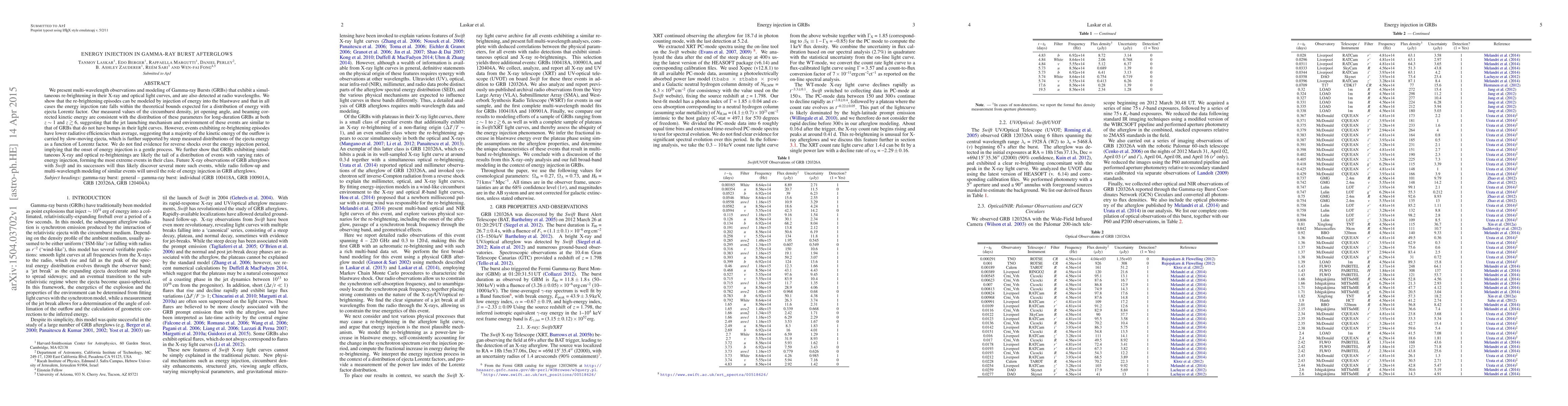 This paper investigates Gamma-ray Bursts (GRBs) with re-brightening episodes in their X-ray and optical light curves, attributing these to energy injection into the blastwave. The study finds that these events have similar jet parameters to other long-duration GRBs but lower radiative efficiencies, suggesting kinetic energy is carried by slow-moving ejecta.