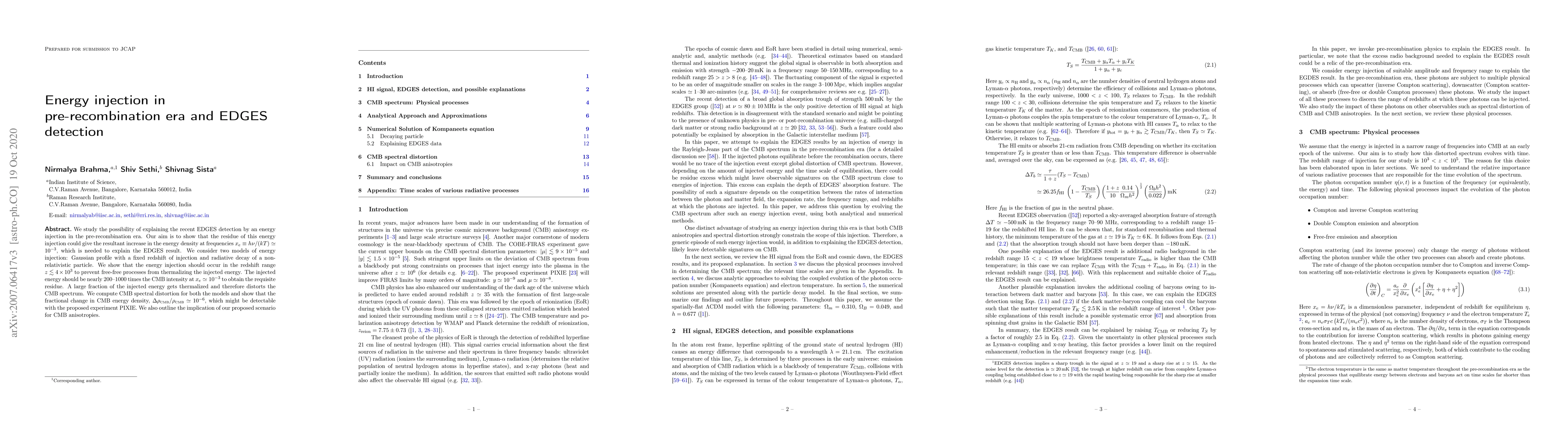 We study the possibility of explaining the recent EDGES detection by an energy injection in the pre-recombination era. Our aim is to show that the residue of this energy injection could give the resultant increase in the energy density at frequencies $x_e \equiv h\nu/(kT) \simeq 10^{-3}$, which is needed to explain the EDGES result. We consider two models of energy injection: Gaussian profile with a fixed redshift of injection and radiative decay of a non-relativistic particle. We show that the energy injection should occur in the redshift range $z\lesssim 4 \times 10^3$ to prevent free-free processes from thermalizing the injected energy. The injected energy should be nearly 200--1000 times the CMB intensity at $x_e \simeq 10^{-3}$ to obtain the requisite residue. A large fraction of the injected energy gets thermalized and therefore distorts the CMB spectrum. We compute CMB spectral distortion for both the models and show that the fractional change in CMB energy density, $\Delta \rho_{\rm \scriptscriptstyle CMB}/\rho_{\rm \scriptscriptstyle CMB} \simeq 10^{-6}$, which might be detectable with the proposed experiment PIXIE. We also outline the implication of our proposed scenario for CMB anisotropies.