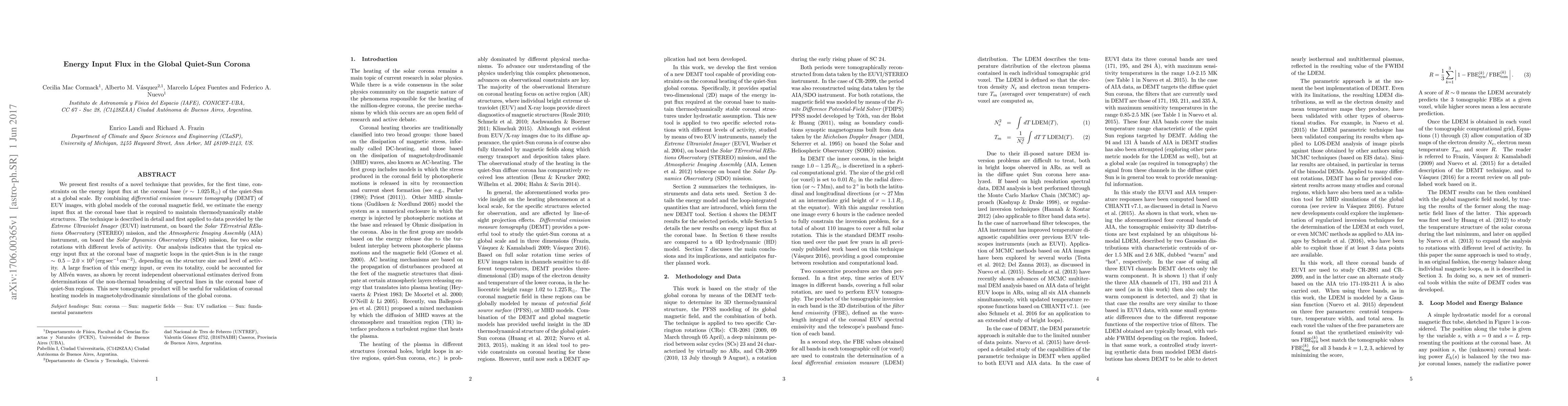 We present first results of a novel technique that provides, for the first time, constraints on the energy input flux at the coronal base ($r\sim\,1.025\,{\rm R}_\odot$) of the quiet-Sun at a global scale. By combining differential emission measure tomography (DEMT) of EUV images, with global models of the coronal magnetic field, we estimate the energy input flux at the coronal base that is required to maintain thermodynamically stable structures. The technique is described in detail and first applied to data provided by the Extreme Ultraviolet Imager (EUVI) instrument, on board the Solar TErrestrial RElations Observatory (STEREO) mission, and the Atmospheric Imaging Assembly (AIA) instrument, on board the Solar Dynamics Observatory (SDO) mission, for two solar rotations with different levels of activity. Our analysis indicates that the typical energy input flux at the coronal base of magnetic loops in the quiet-Sun is in the range $\sim\,0.5-2.0\times 10^5\,{\rm (erg\,sec^{-1}\,{\rm cm}^{-2})}$, depending on the structure size and level of activity. A large fraction of this energy input, or even its totality, could be accounted for by Alfv\'en waves, as shown by recent independent observational estimates derived from determinations of the non-thermal broadening of spectral lines in the coronal base of quiet-Sun regions. This new tomography product will be useful for validation of coronal heating models in magnetohydrodinamic simulations of the global corona.