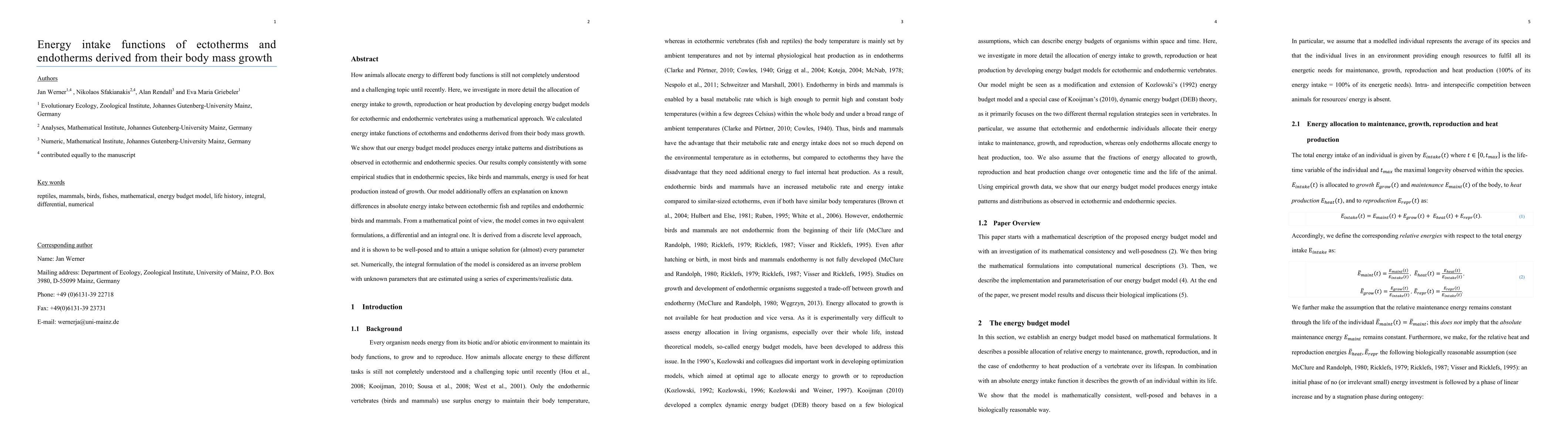 How animals allocate energy to different body functions is still not completely understood and a challenging topic until recently. Here, we investigate in more detail the allocation of energy intake to growth, reproduction or heat production by developing energy budget models for ectothermic and endothermic vertebrates using a mathematical approach. We calculated energy intake functions of ectotherms and endotherms derived from their body mass growth. We show that our energy budget model produces energy intake patterns and distributions as observed in ectothermic and endothermic species. Our results comply consistently with some empirical studies that in endothermic species, like birds and mammals, energy is used for heat production instead of growth. Our model additionally offers an explanation on known differences in absolute energy intake between ectothermic fish and reptiles and endothermic birds and mammals. From a mathematical point of view, the model comes in two equivalent formulations, a differential and an integral one. It is derived from a discrete level approach, and it is shown to be well-posed and to attain a unique solution for (almost) every parameter set. Numerically, the integral formulation of the model is considered as an inverse problem with unknown parameters that are estimated using a series of experiments/realistic data.