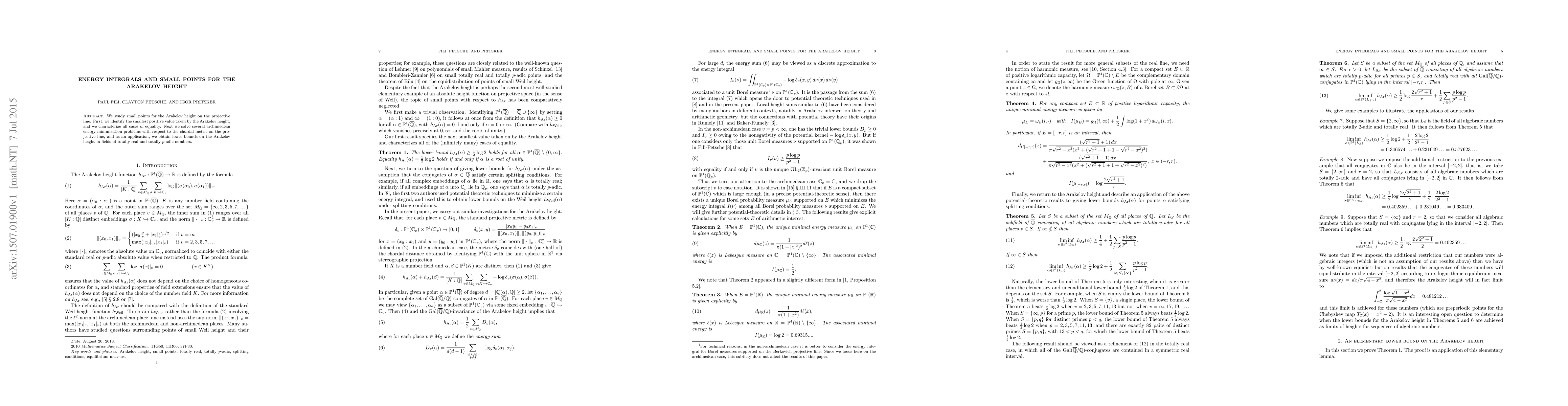 This paper investigates small points for the Arakelov height on the projective line, identifying the smallest positive value and characterizing equality cases. It also solves archimedean energy minimization problems, yielding lower bounds on the Arakelov height for fields of totally real and totally p-adic numbers.
