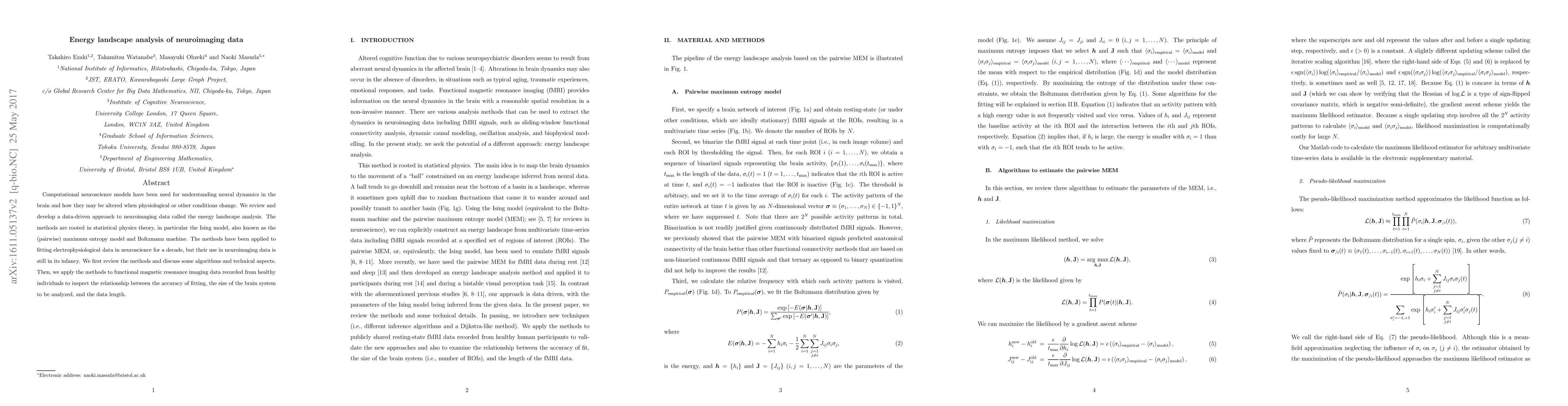 This paper reviews and develops an energy landscape analysis approach for neuroimaging data, rooted in statistical physics and the Ising model. The authors apply these methods to fMRI data from healthy individuals to explore the relationship between fitting accuracy, brain system size, and data length.