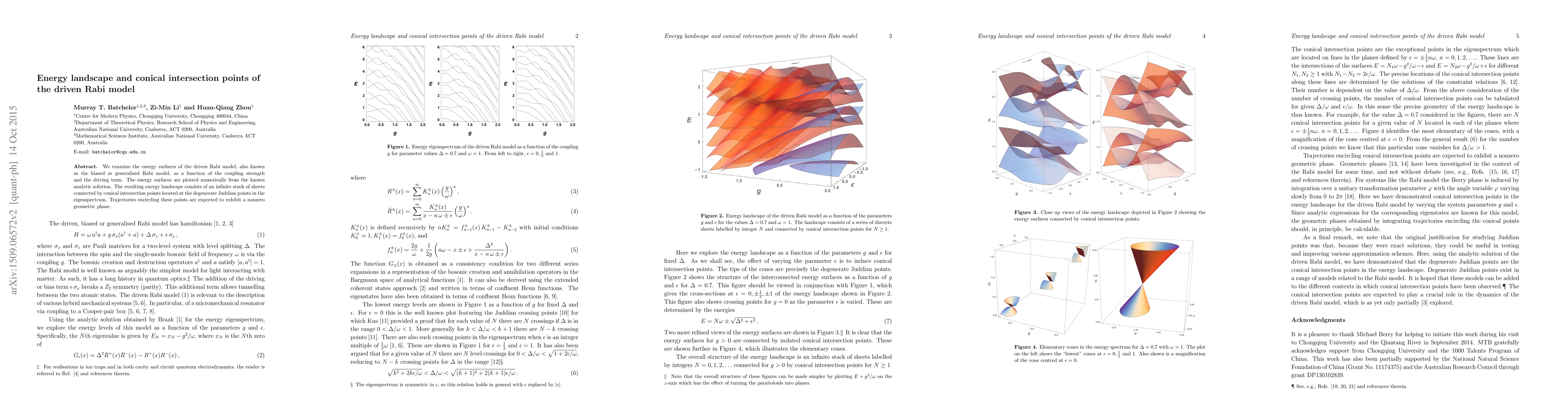 We examine the energy surfaces of the driven Rabi model, also known as the biased or generalised Rabi model, as a function of the coupling strength and the driving term. The energy surfaces are plotted numerically from the known analytic solution. The resulting energy landscape consists of an infinite stack of sheets connected by conical intersection points located at the degenerate Juddian points in the eigenspectrum. Trajectories encircling these points are expected to exhibit a nonzero geometric phase.