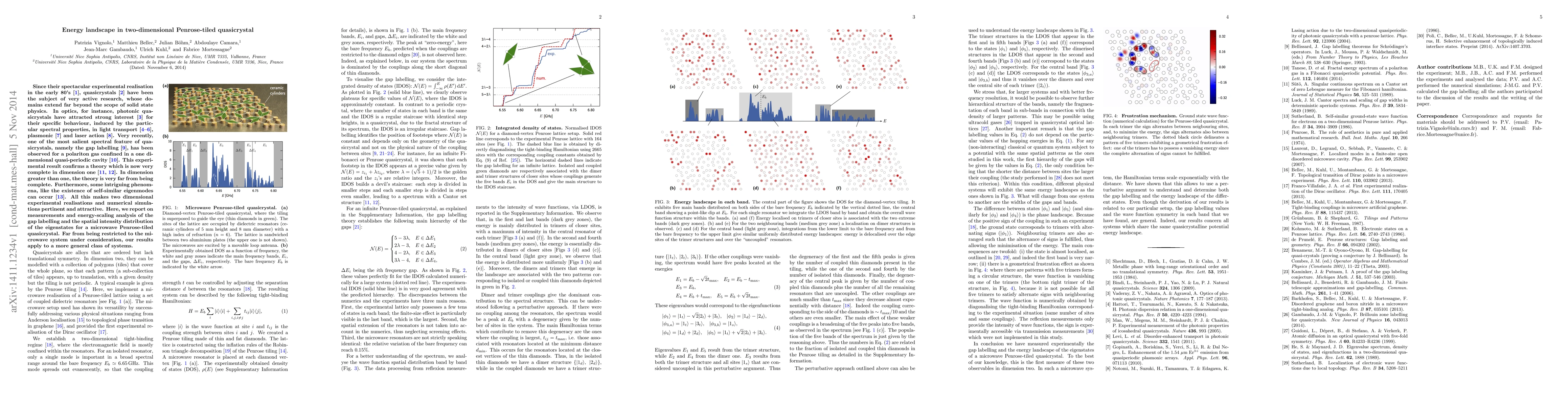 Since their spectacular experimental realisation in the early 80's, quasicrystals have been the subject of very active research, whose domains extend far beyond the scope of solid state physics. In optics, for instance, photonic quasicrystals have attracted strong interest for their specific behaviour, induced by the particular spectral properties, in light transport, plasmonic and laser action. Very recently, one of the most salient spectral feature of quasicrystals, namely the gap labelling, has been observed for a polariton gas confined in a one dimensional quasi-periodic cavity. This experimental result confirms a theory which is now very complete in dimension one. In dimension greater than one, the theory is very far from being complete. Furthermore, some intriguing phenomena, like the existence of self-similar eigenmodes can occur. All this makes two dimensional experimental realisations and numerical simulations pertinent and attractive. Here, we report on measurements and energy-scaling analysis of the gap labelling and the spatial intensity distribution of the eigenstates for a microwave Penrose-tiled quasicrystal. Far from being restricted to the microwave system under consideration, our results apply to a more general class of systems.