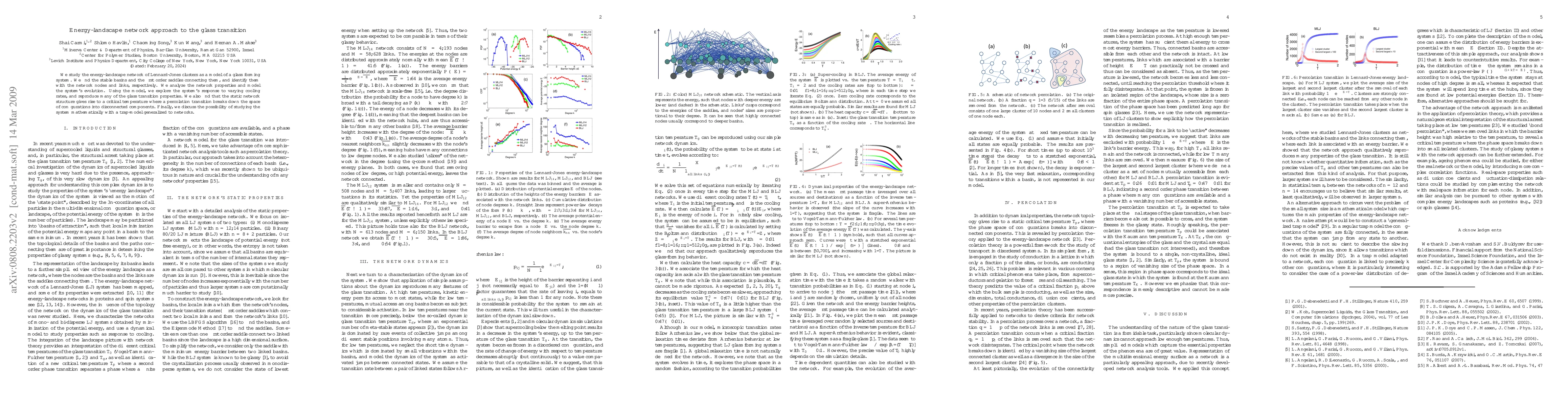 This paper employs an energy-landscape network approach to model Lennard-Jones clusters, identifying stable basins and saddles as nodes and links, respectively. The study reveals a critical temperature where a percolation transition divides the configuration space, and it successfully reproduces many glass transition properties under varying cooling rates.