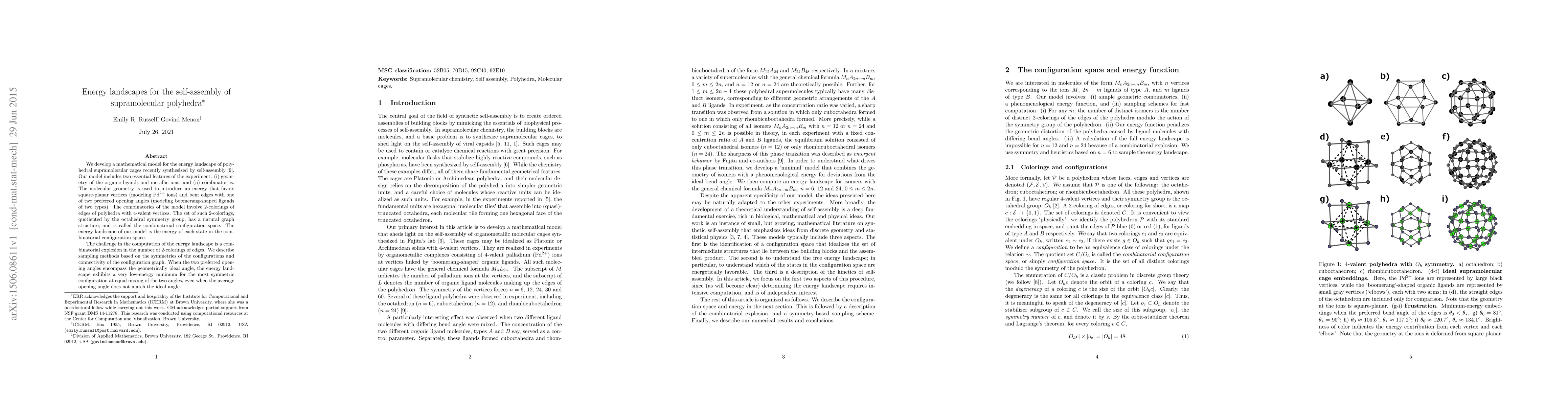 We develop a mathematical model for the energy landscape of polyhedral supramolecular cages recently synthesized by self-assembly [Sun et al., Science 2010]. Our model includes two essential features of the experiment: (i) geometry of the organic ligands and metallic ions; and (ii) combinatorics. The molecular geometry is used to introduce an energy that favors square-planar vertices (modeling $\mathrm{Pd}^{2+}$ ions) and bent edges with one of two preferred opening angles (modeling boomerang-shaped ligands of two types). The combinatorics of the model involve $2$-colorings of edges of polyhedra with $4$-valent vertices. The set of such $2$-colorings, quotiented by the octahedral symmetry group, has a natural graph structure, and is called the combinatorial configuration space. The energy landscape of our model is the energy of each state in the combinatorial configuration space. The challenge in the computation of the energy landscape is a combinatorial explosion in the number of $2$-colorings of edges. We describe sampling methods based on the symmetries of the configurations and connectivity of the configuration graph. When the two preferred opening angles encompass the geometrically ideal angle, the energy landscape exhibits a very low-energy minimum for the most symmetric configuration at equal mixing of the two angles, even when the average opening angle does not match the ideal angle.