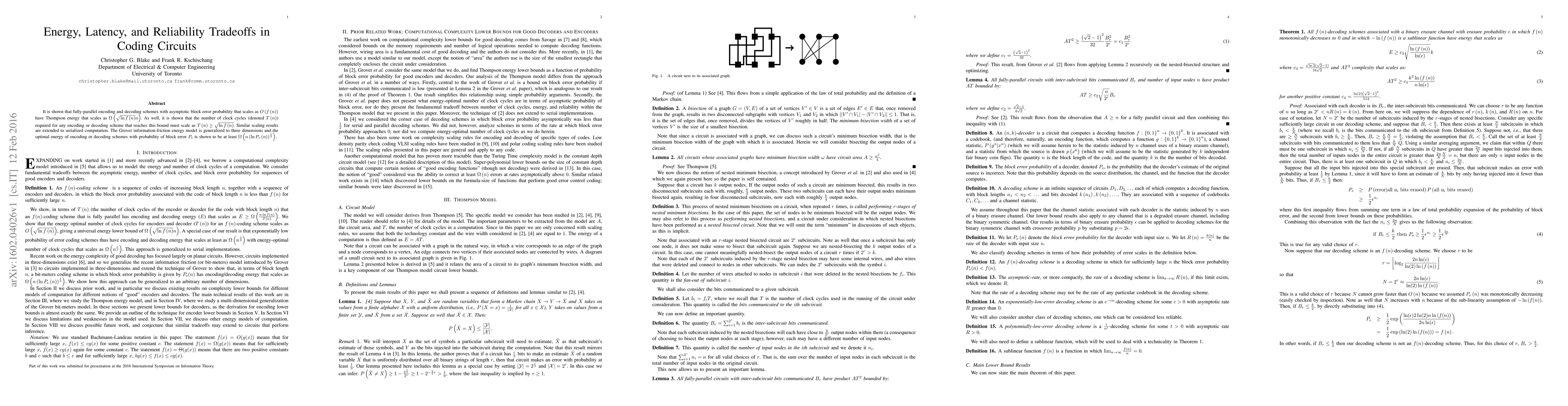 This research reveals that parallel encoding and decoding schemes, with block error probability scaling as O(f(n)), have minimum Thompson energy scaling as Ω(√ln f(n)n). It also establishes that achieving this bound requires at least Ω(√ln f(n)) clock cycles. These findings extend to serialized computation, and the Grover information-friction energy model is generalized to three dimensions, demonstrating that optimal encoding/decoding energy scales as Ω(n((ln P_e(n))^1/3)).