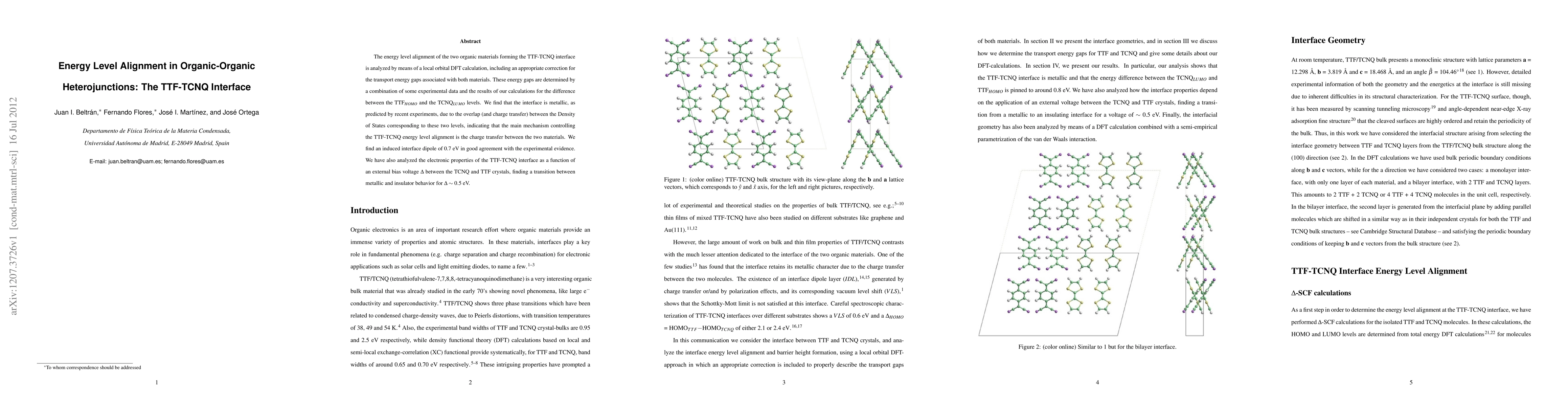 This study uses DFT calculations to analyze the energy level alignment at the TTF-TCNQ interface, revealing metallic behavior due to charge transfer and an induced interface dipole of 0.7 eV. The interface exhibits a transition from metallic to insulating behavior under an external bias voltage of ~0.5 eV.