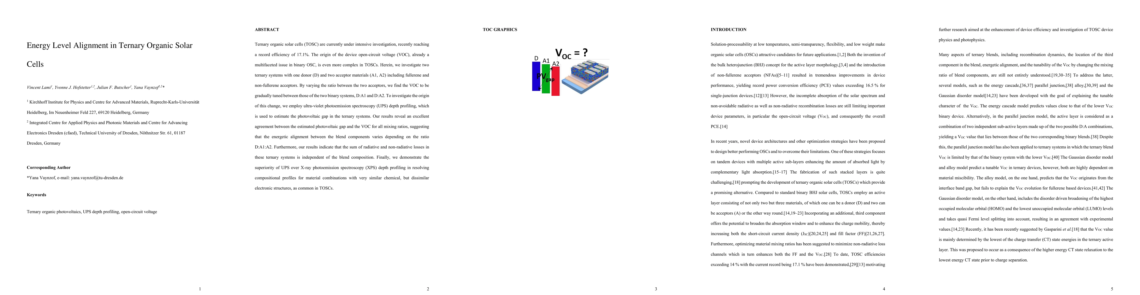 This study investigates the energy level alignment in ternary organic solar cells (TOSC) using ultra-violet photoemission spectroscopy (UPS) depth profiling. The results show that the open-circuit voltage (VOC) in ternary systems is tunable based on the ratio of two acceptor materials, aligning with the photovoltaic gap estimated by UPS, indicating that the energetic alignment depends on the blend composition.