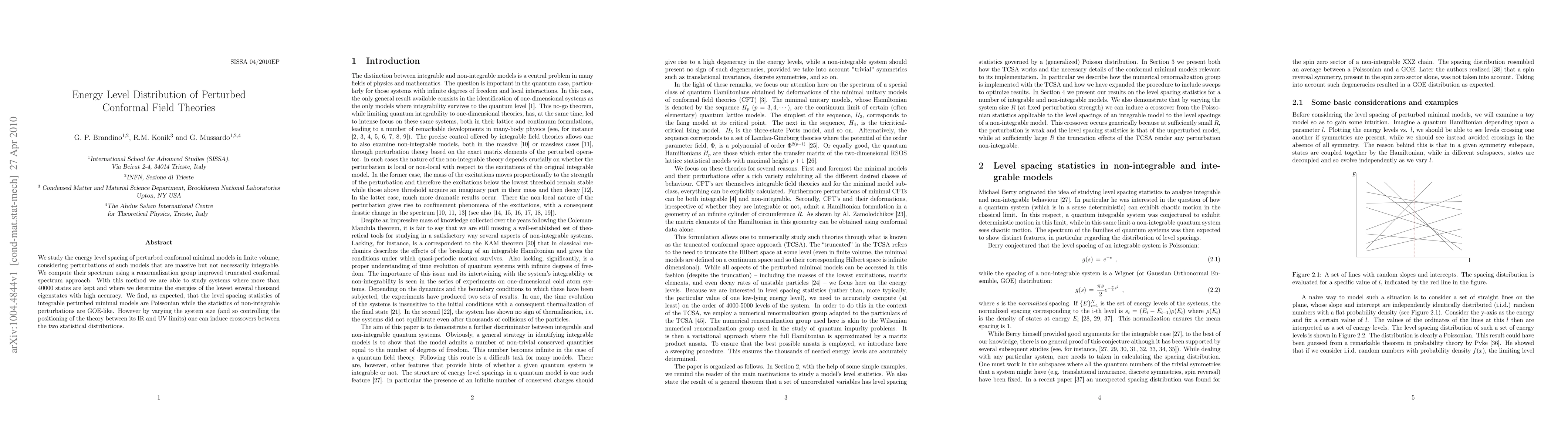 Researchers studied energy level distribution of perturbed conformal field theories, finding that non-integrable systems exhibit GOE-like level spacing statistics that can crossover to Poissonian behavior with varying system size.