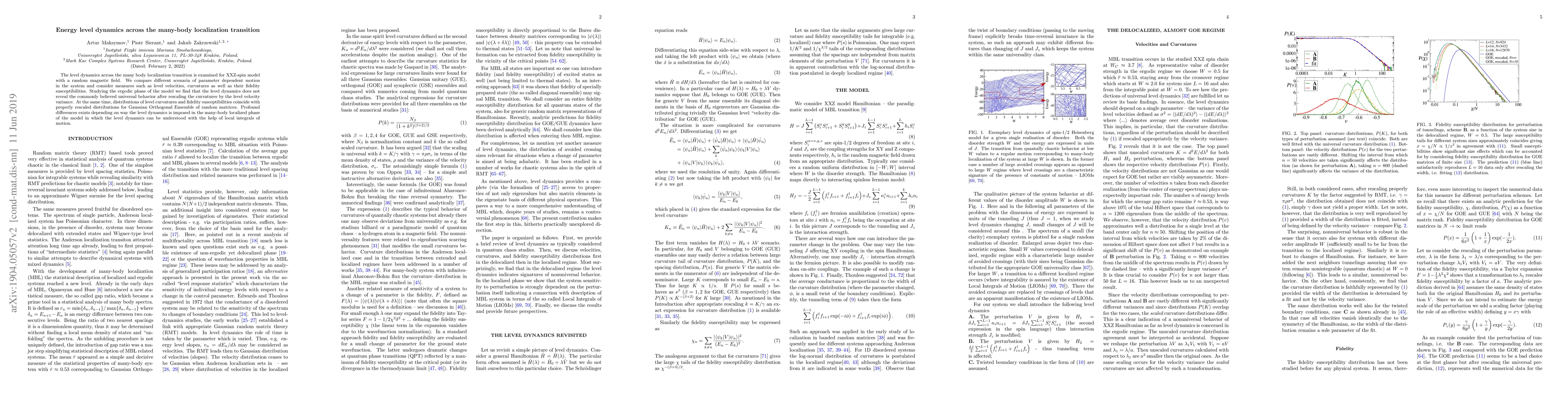 This paper investigates the energy level dynamics in the many-body localization transition of the XXZ-spin model with random magnetic fields, finding that level dynamics in the ergodic phase do not follow the expected universal behavior after rescaling. However, level curvatures and fidelity susceptibilities match those of the Gaussian Orthogonal Ensemble, while the localized phase exhibits distinct dynamics linked to local integrals of motion.