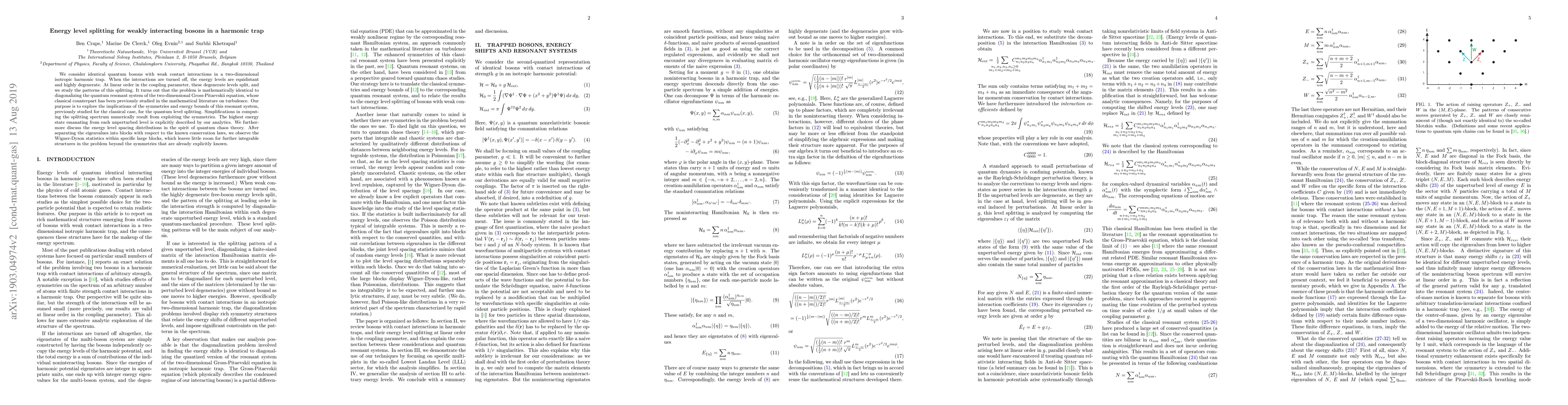 Researchers studied how weak interactions affect energy levels in bosons trapped in a harmonic potential, finding that these interactions lead to level splitting patterns similar to those in turbulent systems.