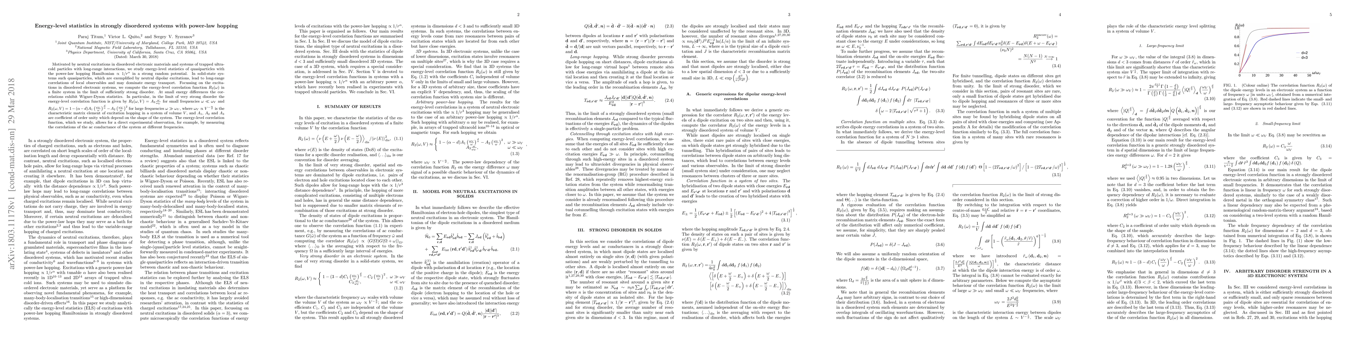 This paper investigates energy-level statistics in strongly disordered systems with power-law hopping, focusing on quasiparticles in disordered electronic materials. It finds that at small energy differences, the energy-level correlation function exhibits Wigner-Dyson statistics, with a specific form depending on the strength of the disorder and the frequency.
