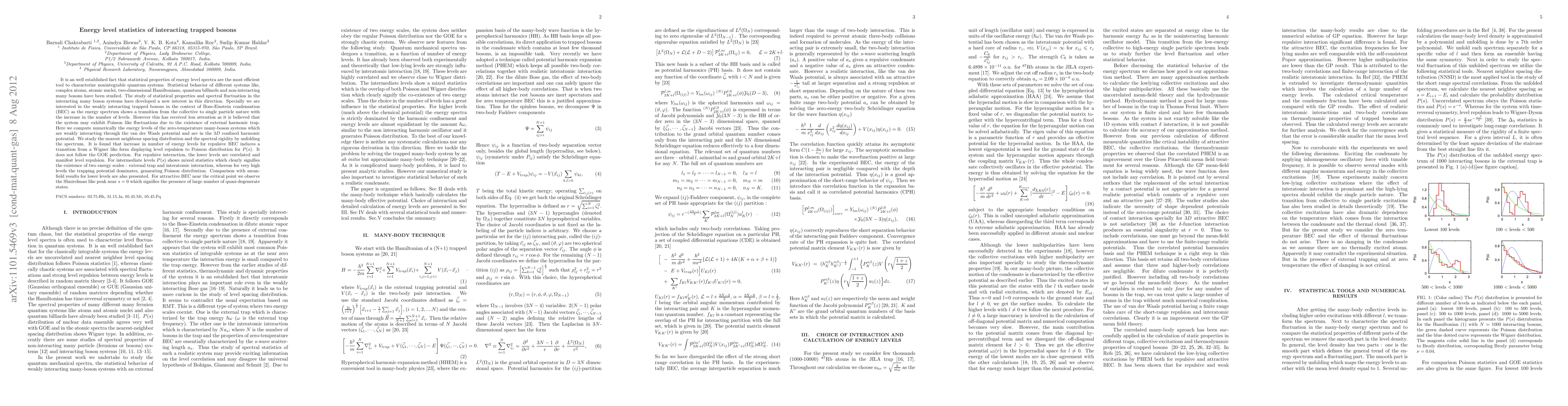 It is an well established fact that statistical properties of energy level spectra are the most efficient tool to characterize nonintegrable quantum systems. The study of statistical properties and spectral fluctuation in the interacting many boson systems have developed a new interest in this direction. Specially we are interested in the weakly interacting trapped bosons in the context of Bose-Einstein condensation (BEC) as the energy spectrum shows a transition from the collective to single particle nature with the increase in the number of levels. However this has received less attention as it is believed that the system may exhibit Poisson like fluctuations due to the existence of external harmonic trap. Here we compute numerically the energy levels of the zero-temperature many-boson systems which are weakly interacting through the van der Waals potential and are in the 3D confined harmonic potential. We study the nearest neighbour spacing distribution and the spectral rigidity by unfolding the spectrum. It is found that increase in number of energy levels for repulsive BEC induces a transition from a Wigner like form displaying level repulsion to Poisson distribution for P(s). It does not follow the GOE prediction. For repulsive interaction, the lower levels are correlated and manifest level repulsion. For intermediate levels P (s) shows mixed statistic which clearly signifies the existence of two energy scales: external trap and interatomic interaction. Whereas for very high levels the trapping potential dominates, genarating Poisson distribution. Comparison with mean-field results for lower levels are also presented. For attractive BEC near the critical point we observe the Shrielman like peak near s=0 which signifies the presence of large number of quasi-degenerate states.