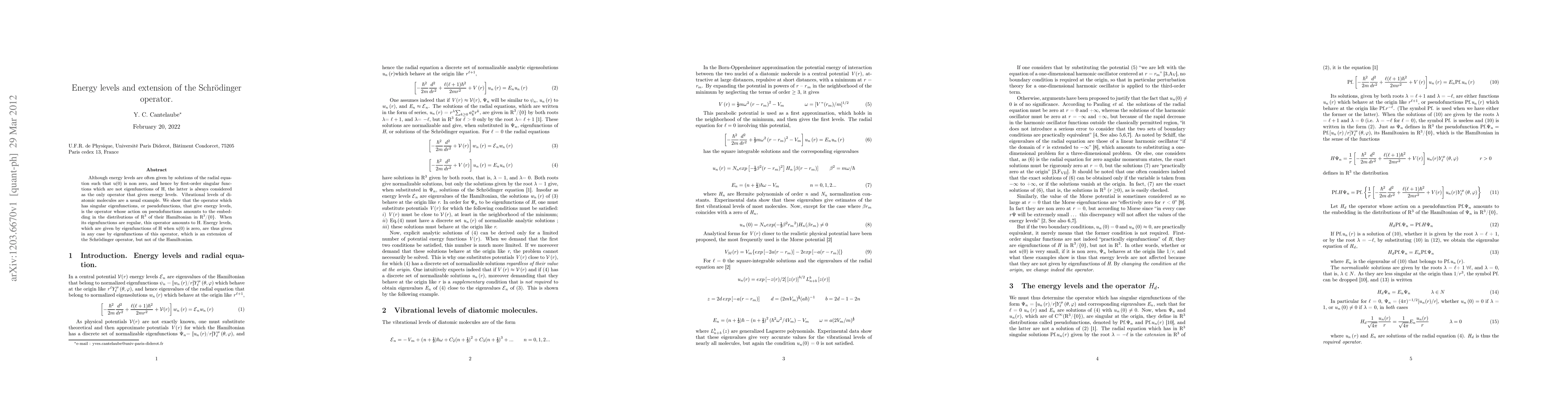 Although energy levels are often given by solutions of the radial equation such that u(0) is non zero, and hence by first-order singular functions which are not eigenfunctions of H, the latter is always considered as the only operator that gives energy levels. Vibrational levels of diatomic molecules are a usual example. We show that the operator which has singular eigenfunctions, or pseudofunctions, that give energy levels, is the operator whose action on pseudofunctions amounts to the embedding in the distributions of R3 of their Hamiltonian in R3/{0}. When its eigenfunctions are regular, this operator amounts to H. Energy levels, which are given by eigenfunctions of H when u(0) is zero, are thus given in any case by eigenfunctions of this operator, which is an extension of the Schrodinger operator, but not of the Hamiltonian.