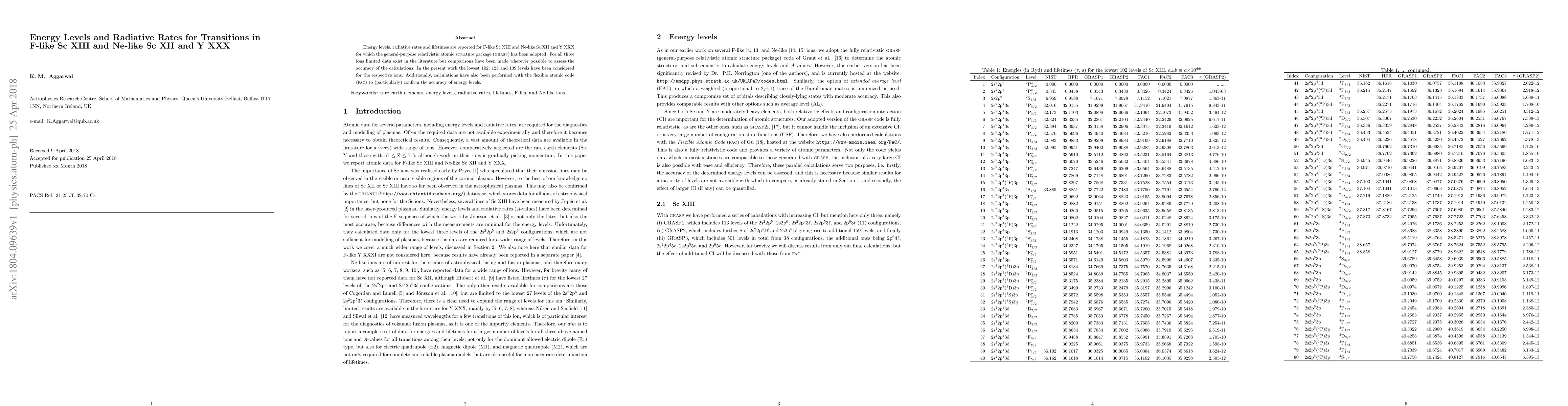 Energy levels, radiative rates and lifetimes are reported for F-like Sc~XIII and Ne-like Sc~XII and Y~XXX for which the general-purpose relativistic atomic structure package ({\sc grasp}) has been adopted. For all three ions limited data exist in the literature but comparisons have been made wherever possible to assess the accuracy of the calculations. In the present work the lowest 102, 125 and 139 levels have been considered for the respective ions. Additionally, calculations have also been performed with the flexible atomic code ({\sc fac}) to (particularly) confirm the accuracy of energy levels.