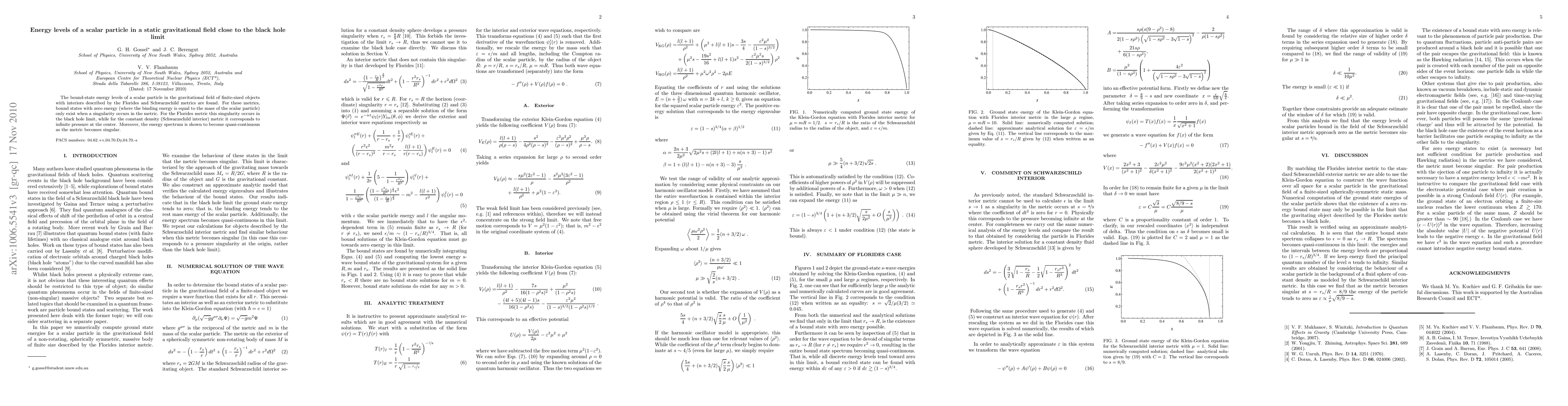 Summary: The study investigates scalar particle energy levels in gravitational fields near black hole limits, finding zero-energy bound states only in singular metrics, with the Florides metric leading to such states in the black hole limit and the Schwarzschild interior metric corresponding to infinite pressure. The energy spectrum becomes quasi-continuous as the metric singularity approaches.