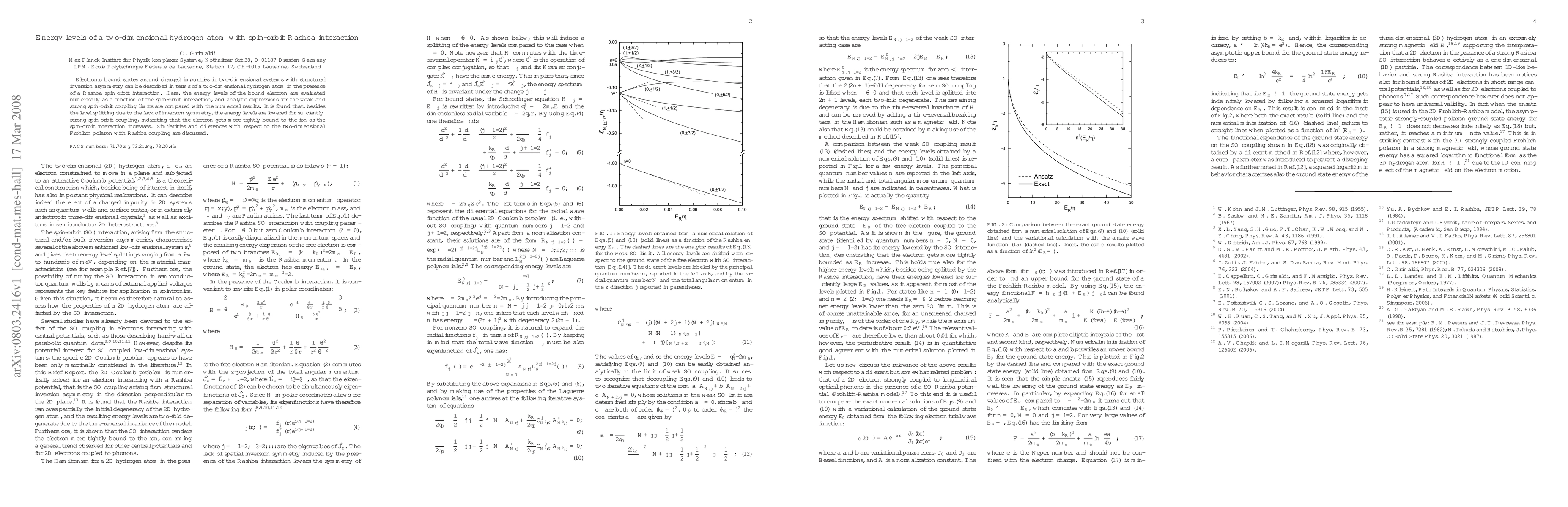 This paper numerically evaluates the energy levels of a two-dimensional hydrogen atom under a Rashba spin-orbit interaction, finding that strong spin-orbit coupling lowers the energy levels, making the electron more tightly bound. Analytic expressions for weak and strong coupling regimes are compared and found to align with numerical results.