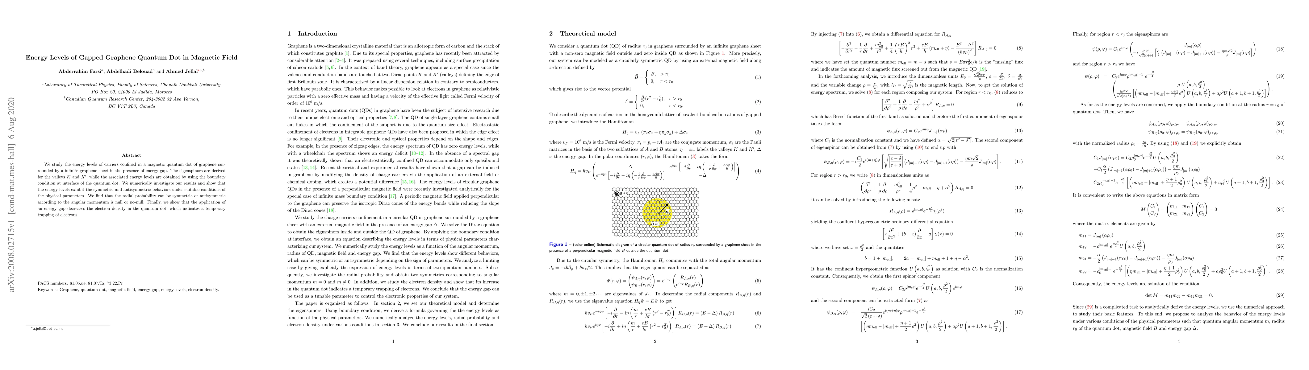 This study examines the energy levels of carriers in a magnetic quantum dot of graphene with an energy gap, deriving eigenspinors for the $K$ and $K'$ valleys and finding symmetric and antisymmetric energy level behaviors under specific conditions. An applied energy gap decreases electron density, indicating temporary electron trapping.