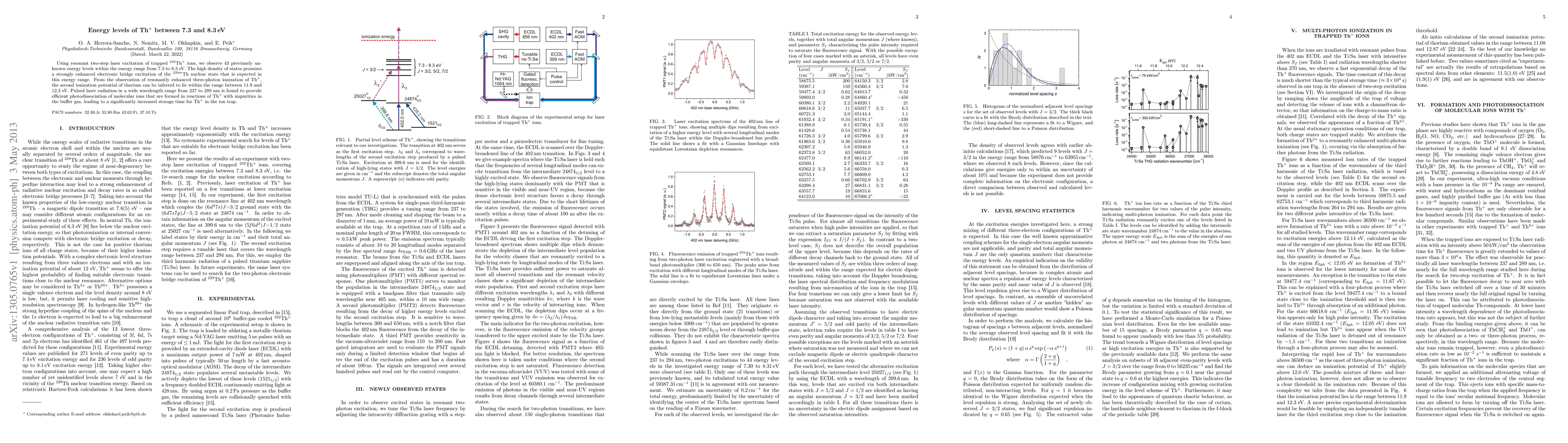 Using resonant two-step laser excitation of trapped 232Th+ ions, we observe 43 previously unknown energy levels within the energy range from 7.3 to 8.3 eV. The high density of states promises a strongly enhanced electronic bridge excitation of the 229mTh nuclear state that is expected in this energy range. From the observation of resonantly enhanced three-photon ionization of Th+, the second ionization potential of thorium can be inferred to lie within the range between 11.9 and 12.3 eV. Pulsed laser radiation in a wide wavelength range from 237 to 289 nm is found to provide efficient photodissociation of molecular ions that are formed in reactions of Th+ with impurities in the buffer gas, leading to a significantly increased storage time for Th+ in the ion trap.