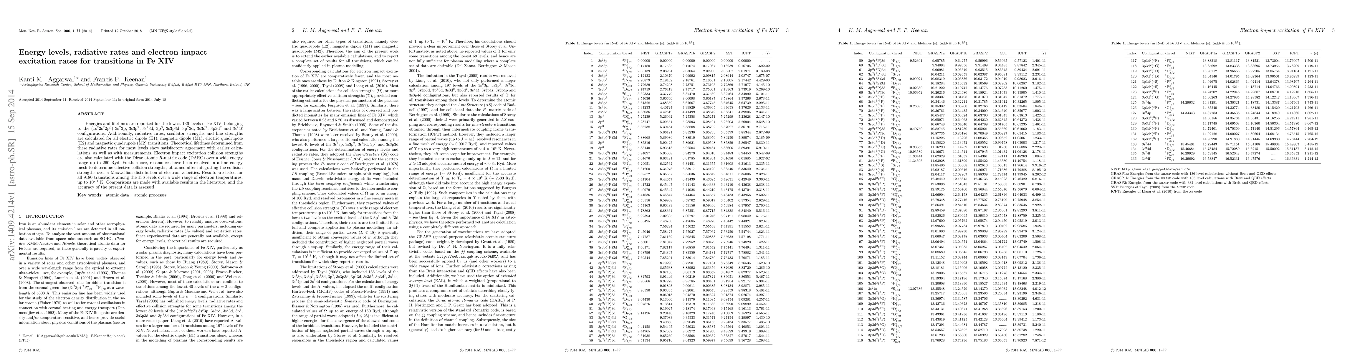 This paper reports on the energy levels, lifetimes, and radiative rates for the lowest 136 levels of Fe XIV, along with electron impact excitation rates for all 9180 transitions among these levels. The results show good agreement with previous calculations and measurements, and are useful for astrophysical plasma diagnostics.