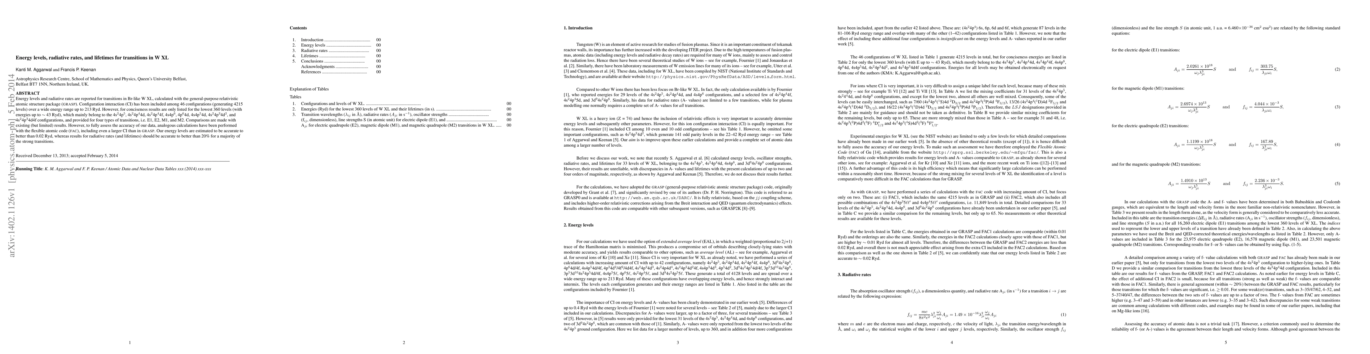 Energy levels and radiative rates are reported for transitions in Br-like W XL, calculated with the general-purpose relativistic atomic structure package ({\sc grasp}). Configuration interaction (CI) has been included among 46 configurations (generating 4215 levels) over a wide energy range up to 213 Ryd. However, for conciseness results are only listed for the lowest 360 levels (with energies up to $\sim$ 43 Ryd), which mainly belong to the 4s$^2$4p$^5$, 4s$^2$4p$^4$4d, 4s$^2$4p$^4$4f, 4s4p$^6$, 4p$^6$4d, 4s4p$^5$4d, 4s$^2$4p$^3$4d$^2$, and 4s$^2$4p$^3$4d4f configurations, and provided for four types of transitions, i.e. E1, E2, M1, and M2. Comparisons are made with existing (but limited) results. However, to fully assess the accuracy of our data, analogous calculations have been performed with the flexible atomic code ({\sc fac}), including even a larger CI than in {\sc grasp}. Our energy levels are estimated to be accurate to better than 0.02 Ryd, whereas results for radiative rates (and lifetimes) should be accurate to better than $20\%$ for a majority of the strong transitions.
